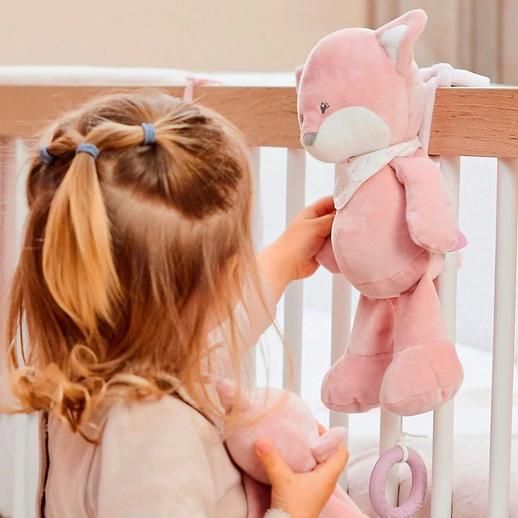 La-Le-Lu… I am the little sister of Alice the Musical, an adorable fox plush toy with a built-in music box that offers your little one a soothing tune of music. With the cords on the back, you can easily attach me to the bed or stroller so you can operate my little corkscrew easily. Just like my big sister, I’m made of an exceptionally soft material that gives your little one a feeling of absolute comfort.