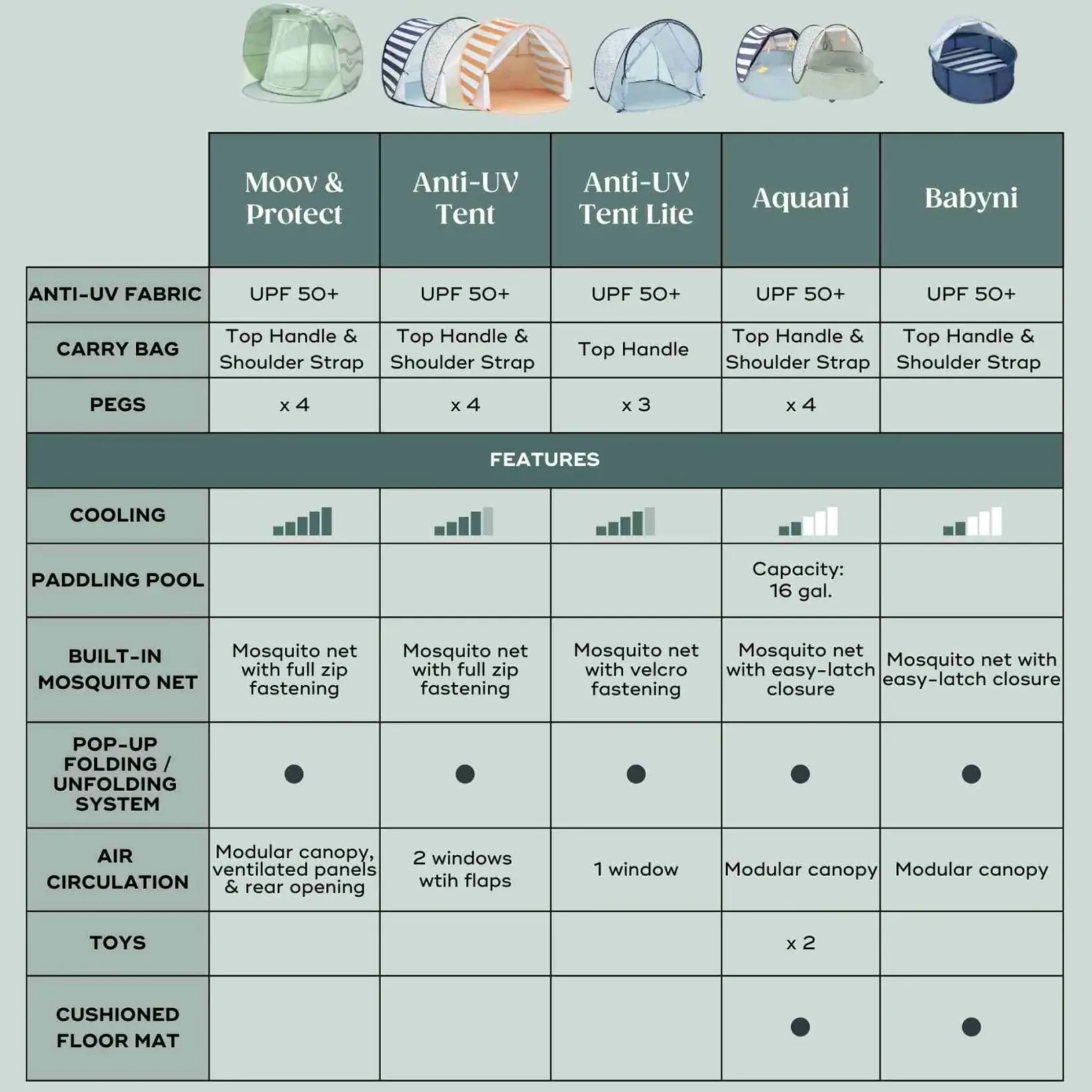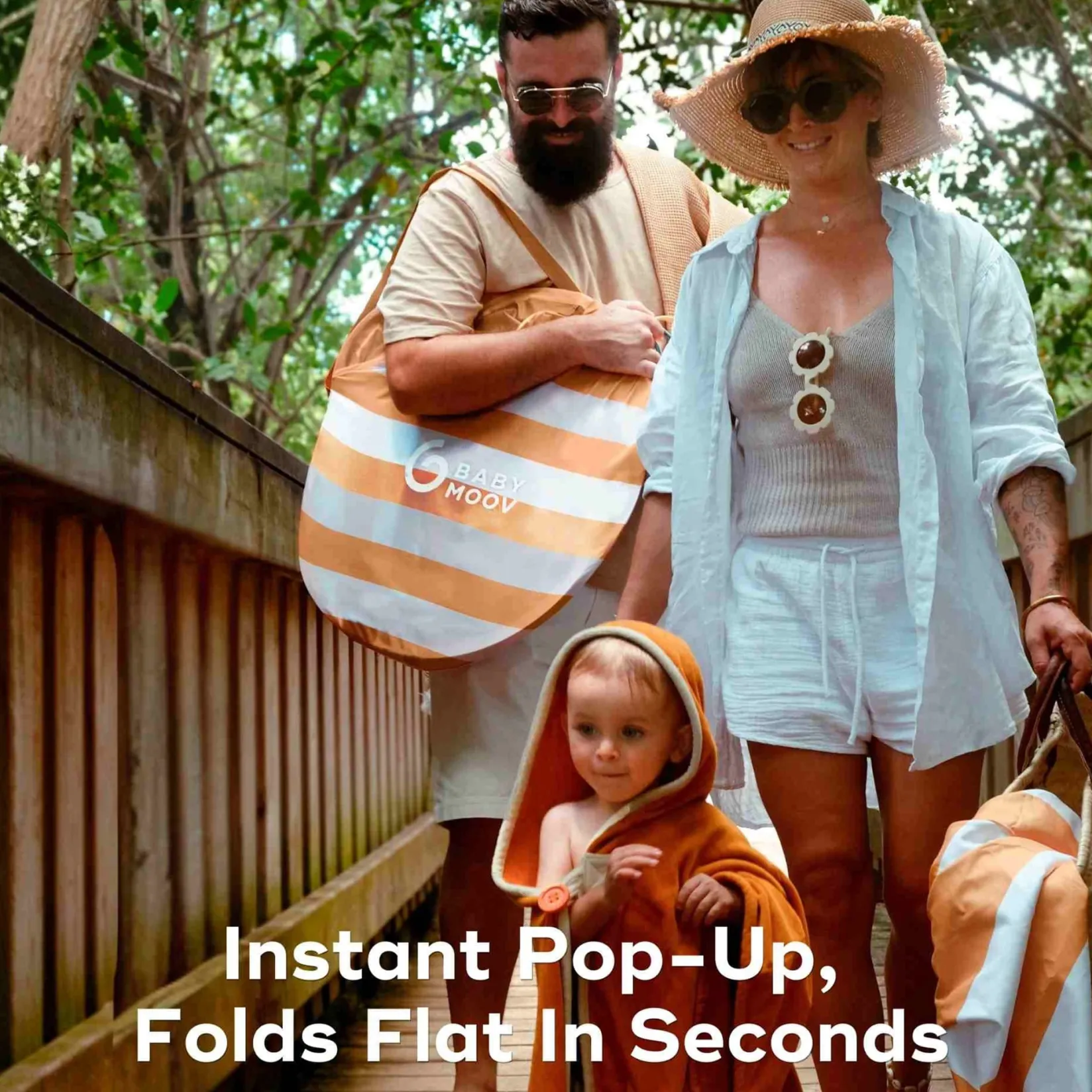Features:-Ultimate sun protection: our best-selling beach tent with UPF 50+ protection blocks over 99% of UVA and UVB rays.-Two ventilation windows provide optimal airflow on hot days.-Convenient to carry: it pops up in seconds and folds down just as quickly.-Its ultra-flat and lightweight carry bag makes it easy to bring along on all your family outings.-Ideal for the beach, the park or your backyard.-Insect protection: say goodbye to annoying insects thanks to the fine mesh mosquito net with zippered closure.-Accessories included: 4 stakes for secure use on sand and grass, plus a carry bag with top handle.-Lifetime warranty: designed to last and covered by the Babymoov Lifetime Warranty.Composition: 100% polyesterTent dimensions (unfolded): 38.5″ x 35.4″ x 33.5″Tent dimensions (folded): 24″Weight: 2 lb