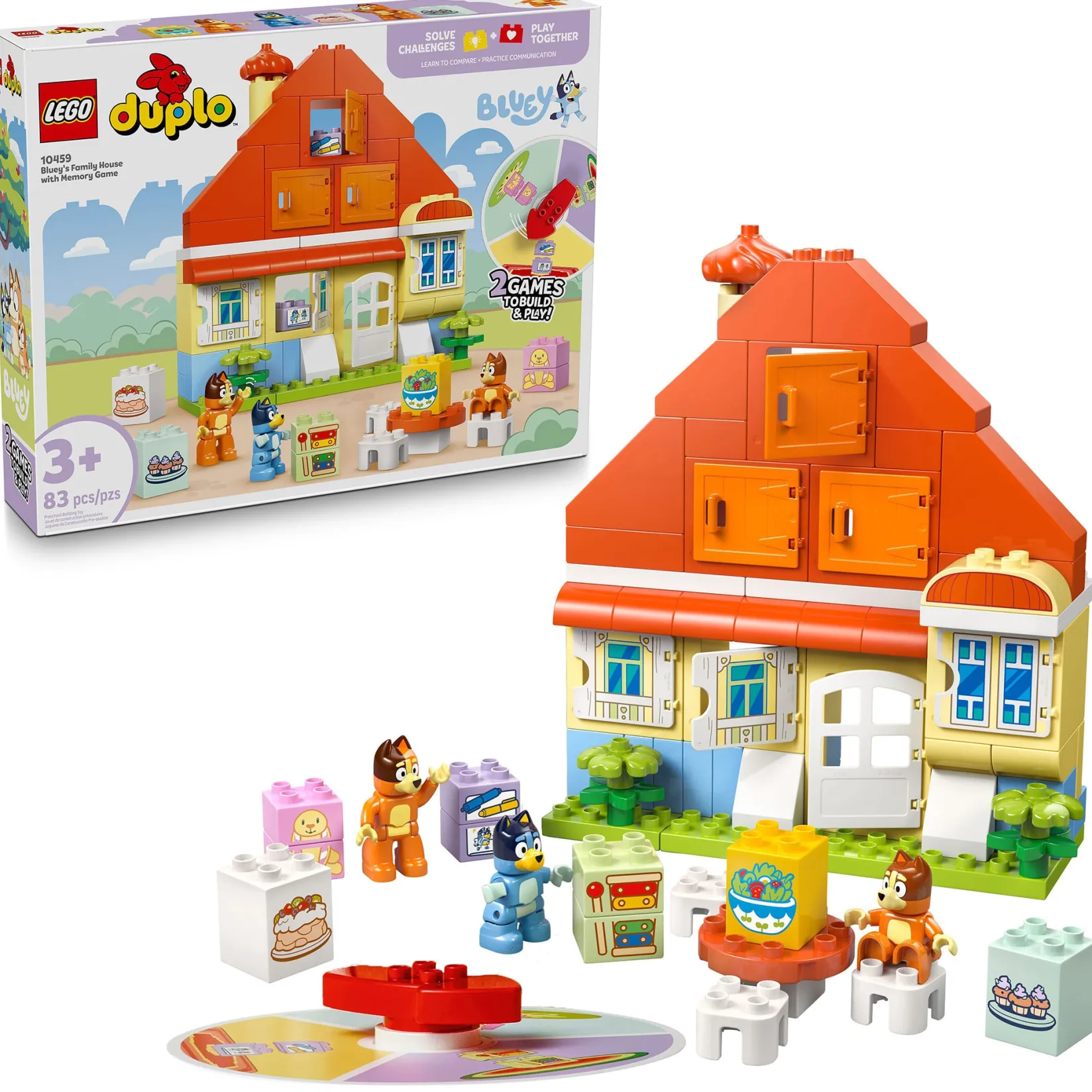 Introduce little ones to double the fun with the interactive LEGO® DUPLO® Bluey Family Home with Memory Game (10459) set, featuring two exciting activities in one colorful buildable playset.