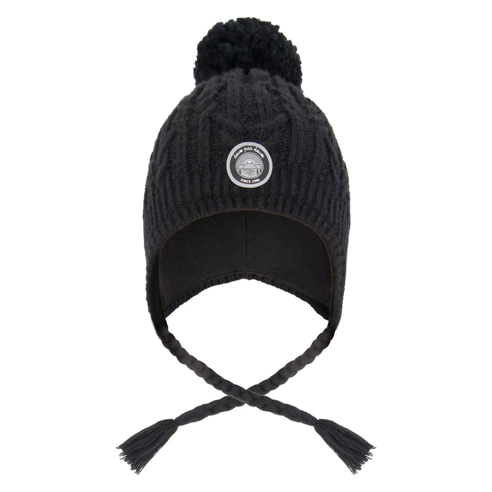Lined with polar fleece for added warmth, this knit cap in off-white is winter weather-approved. In a Peruvian silhouette with extended side panels that cover and protect the ears, this winter hat features a chunky cable knit texture, braided side tassels, a fluffy pompom, and a logo patch for brand distinction.