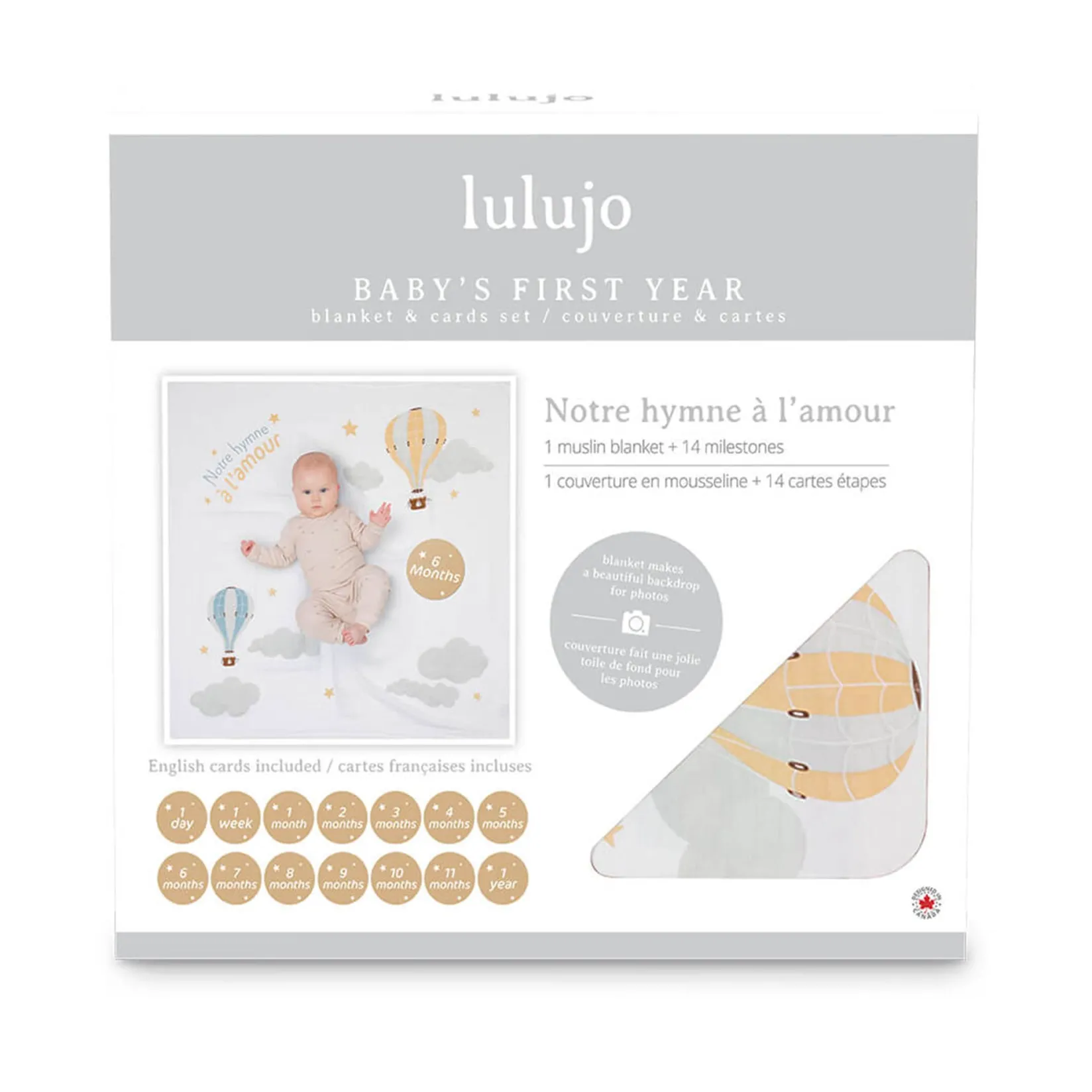 Includes: 1 large muslin blanket + 7 double-sided cards with 14 milestones.