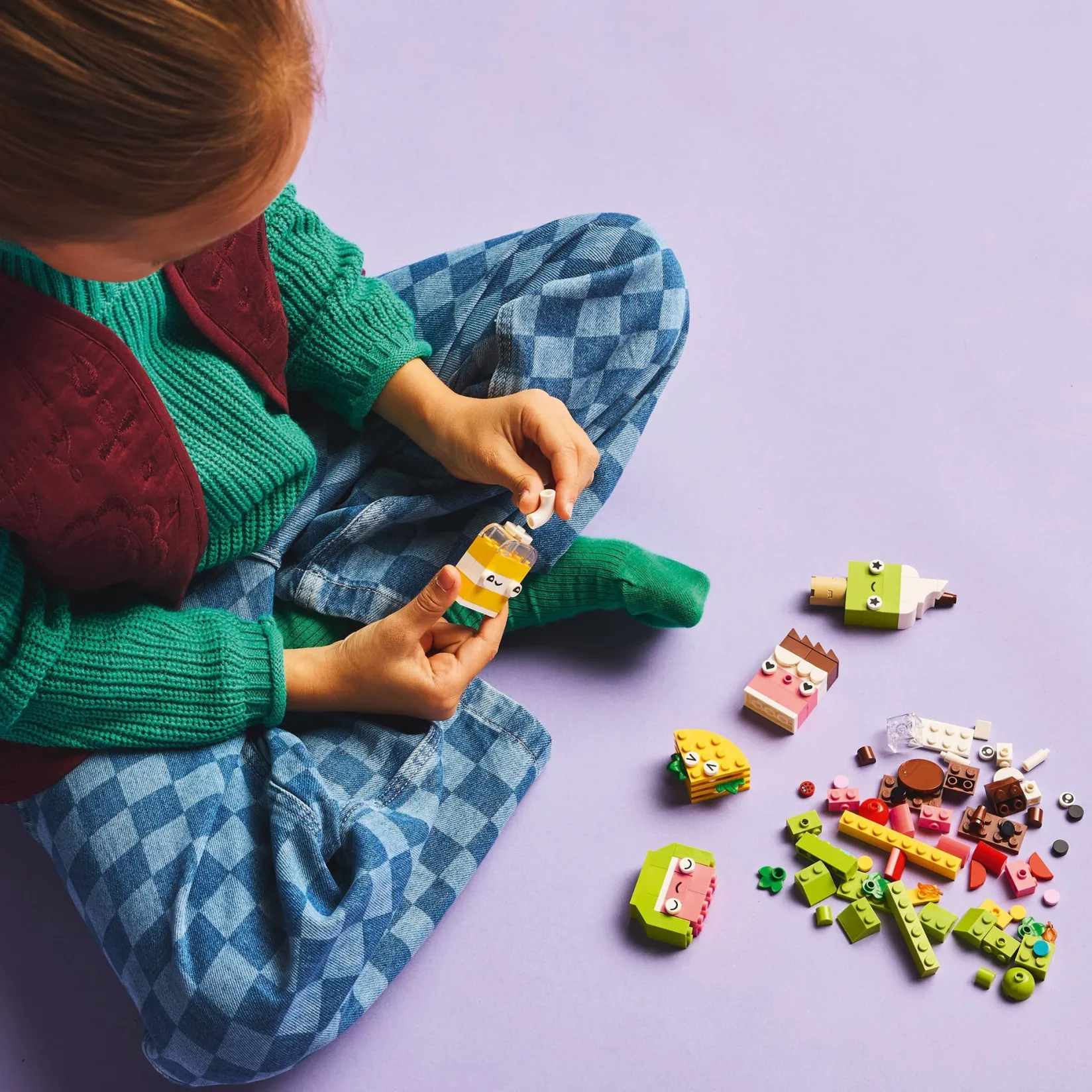 Kids use the colorful mix of building bricks and special pieces – such as eyes, mouths, and various decorative elements – to build 4 cute food friends: a cake, ice cream, avocado, and taco. The creative fun continues as kids mix the bricks to transform them into a sprinkled cake, bubble tea drink, pear, and panini. As children gain confidence in their building skills, they can follow the intuitive building guide to change expressions, shapes, or colors to create new food friends, including a green ice cream, juice box, watermelon slice, chocolate bar, and a giant sandwich.