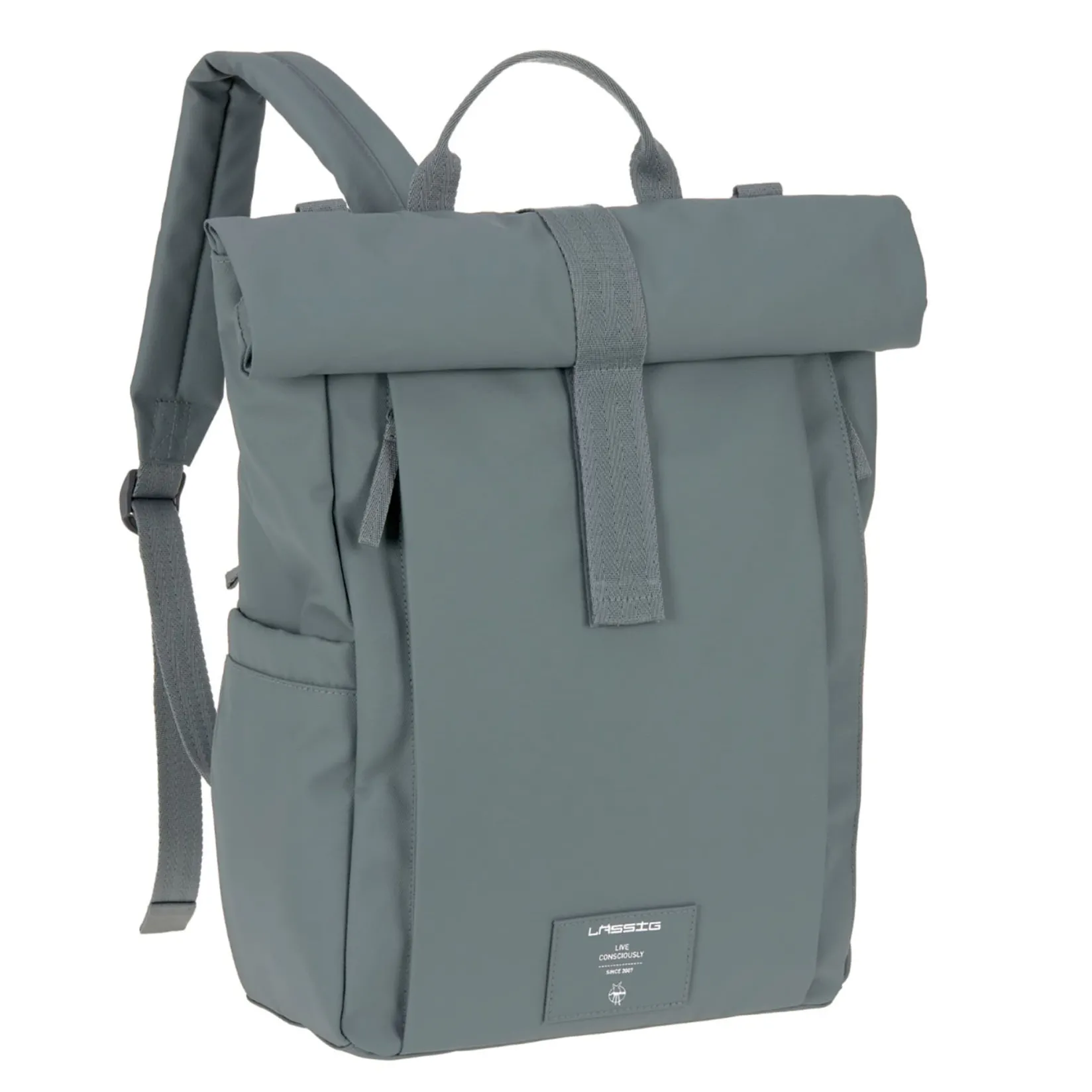The Rolltop Up Backpack changing bag from the LÄSSIG Green Label collection impresses with its clean look, its durability, and all the extra volume.