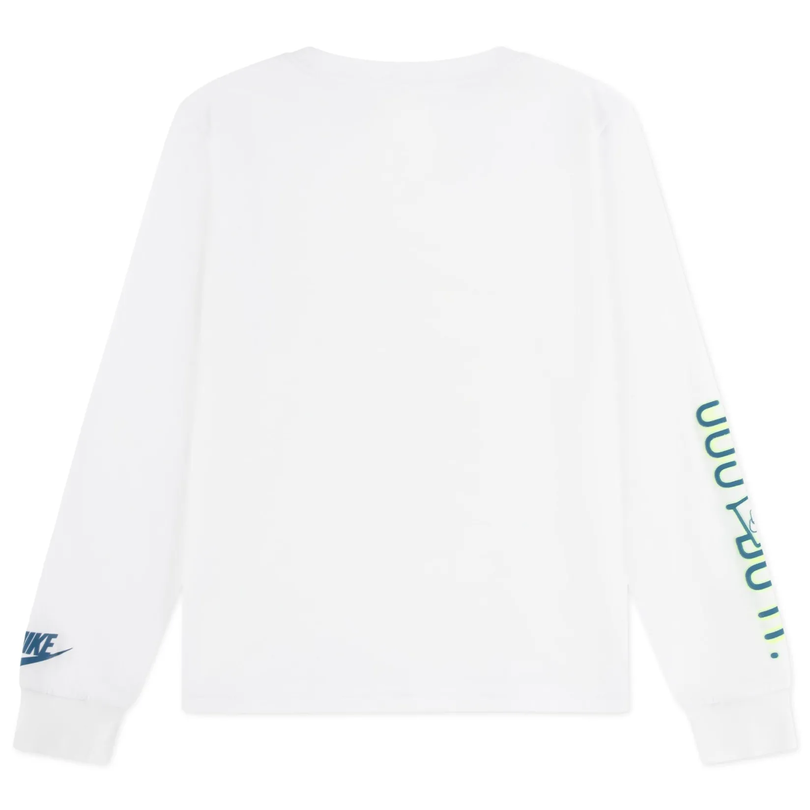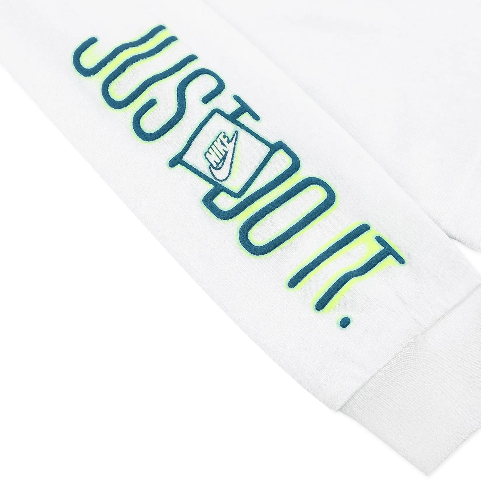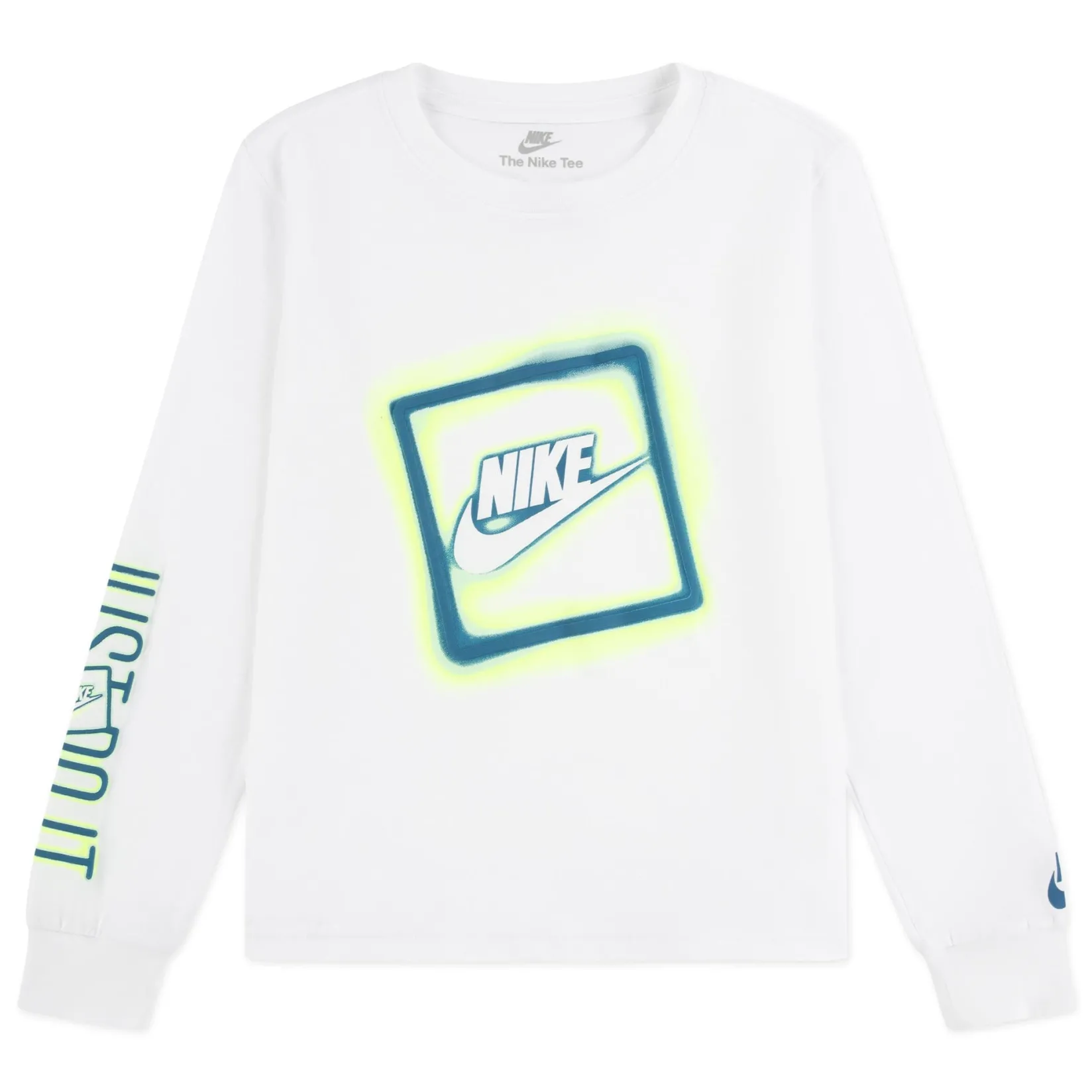 Kids can glow up in this Nike tee, which is made of blended cotton jersey in an oversized silhouette with lightly dropped shoulders for a relaxed fit. The tagless crewneck creates comfy, fuss-free wear and the long sleeves add lightweight, cozy warmth. Style with the Nike Glow With Me Fleece Pants for a coordinated look that will complement their kicks.