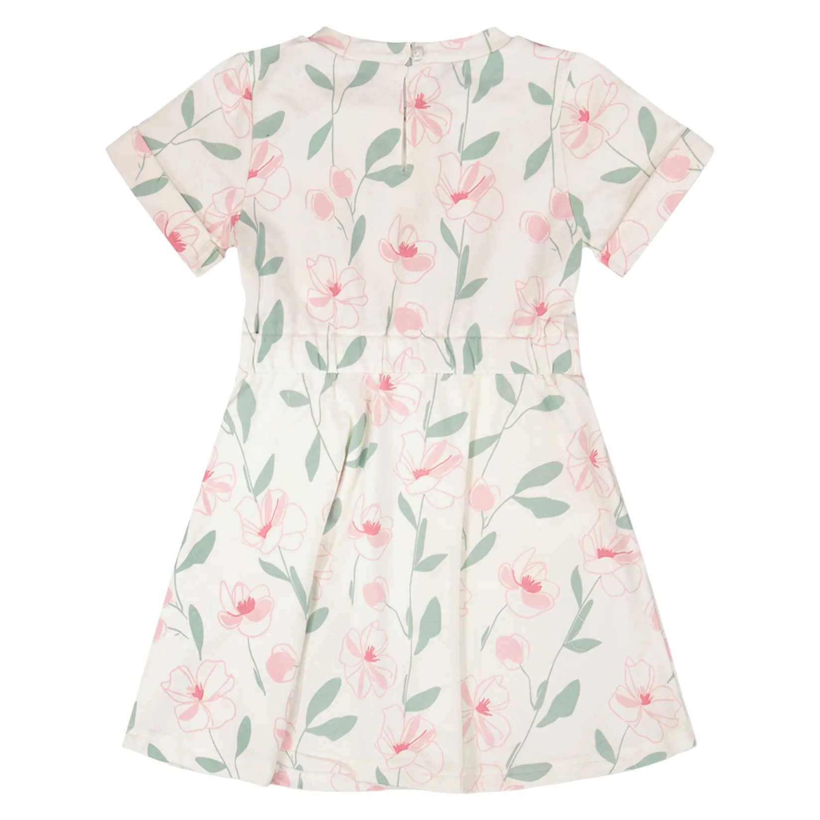 The French terry dress off white with printed flowers is a playful piece with a soft, easy fit. This casual dress features short sleeves, a flowy skirt, an adjustable waist with a drawstring, and a delicate allover floral print. Crafted from a comfortable blend of cotton and elastane, this dress is perfect for everyday wear with a touch of charm.