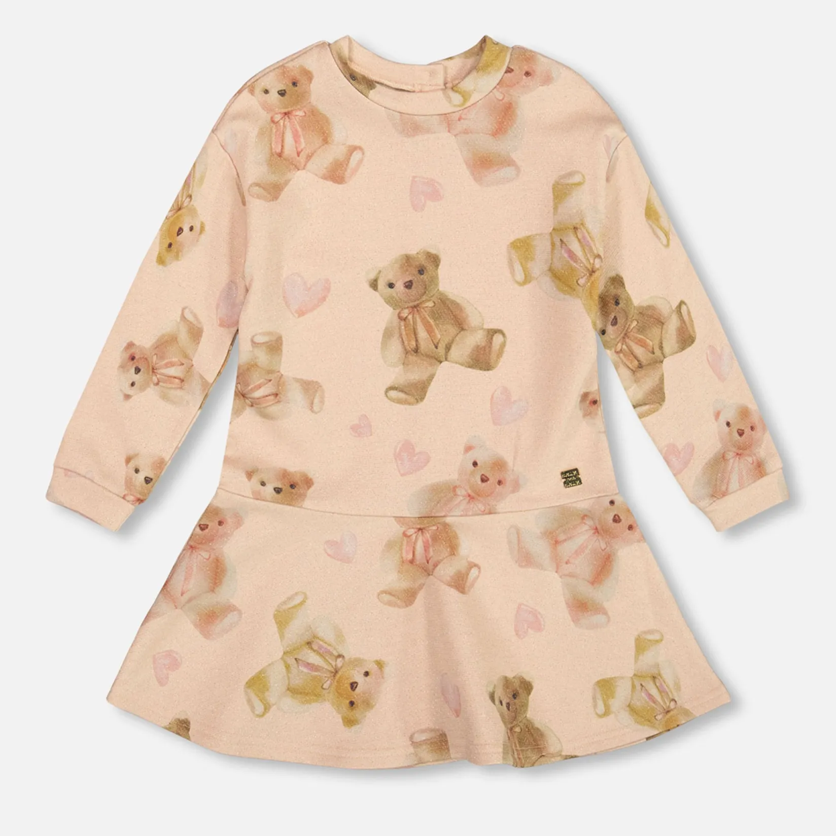 Our French Terry Dress Beige Teddy Bear Print is a cozy and playful option for chilly days. This sweatshirt dress features an allover teddy bear and heart print on soft brushed terry, long sleeves, dropped shoulders, a round neckline and a drop-waist pleated skirt for extra twirl. It’s the perfect balance of fun and comfort for girls who love sweet details.