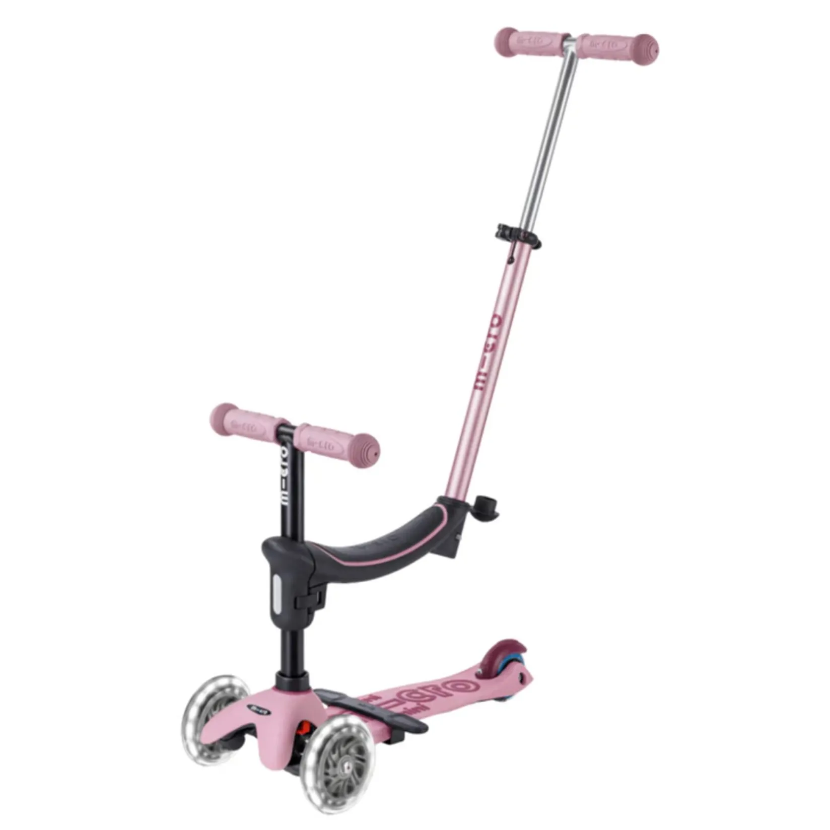 -Stage 3: move the seat/T-bar combo to the Mini scooter base for first rides on wheels with parent support using the push bar