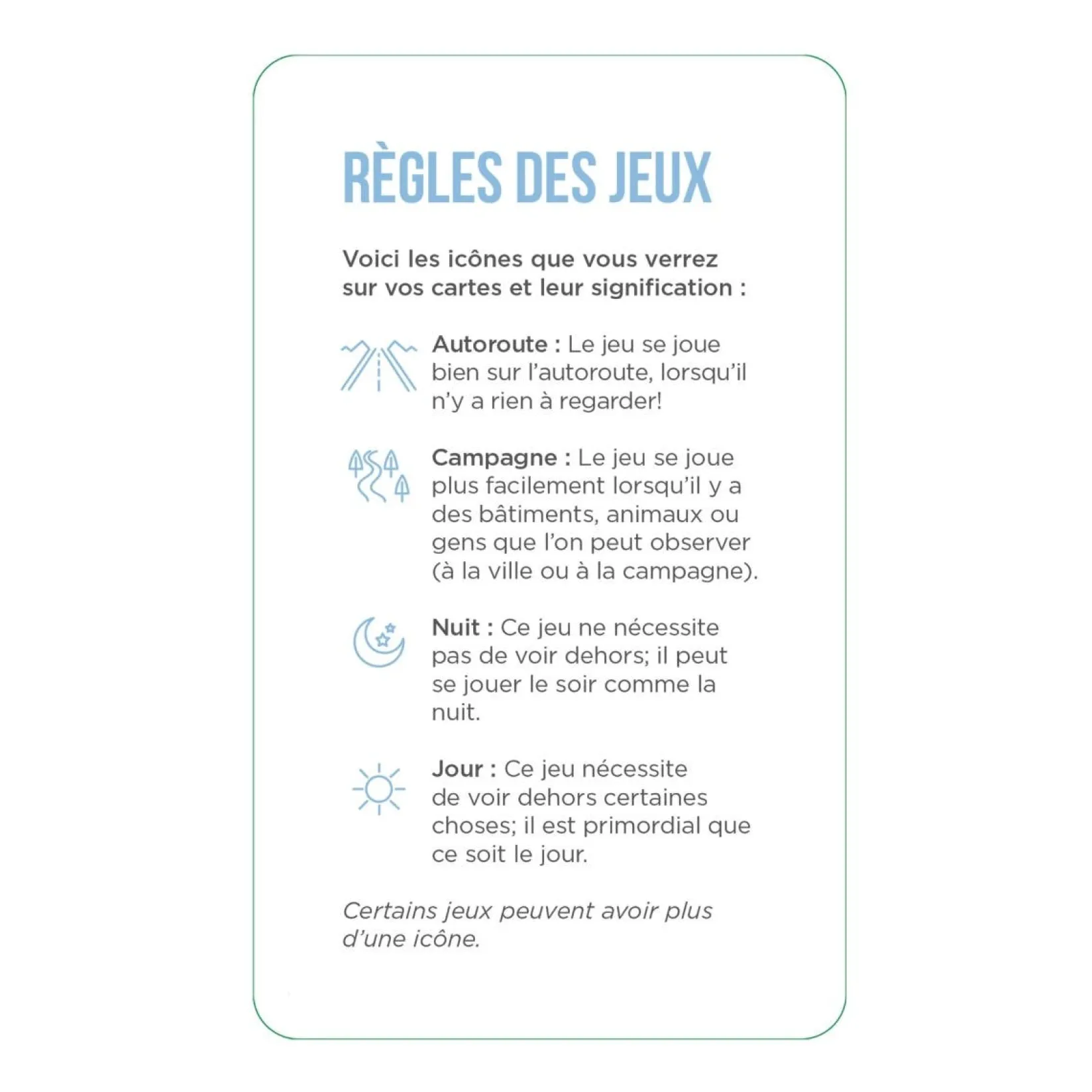 The «Nos Bons Moments-Sur la Route» game offers 48 simple and fun activities to reduce impatience and boredom during car trips. To do day, night, on the highway, in the countryside or in town! Purpose of the game: Draw a card that will determine the activity for the next few minutes / hours. It’s easy!