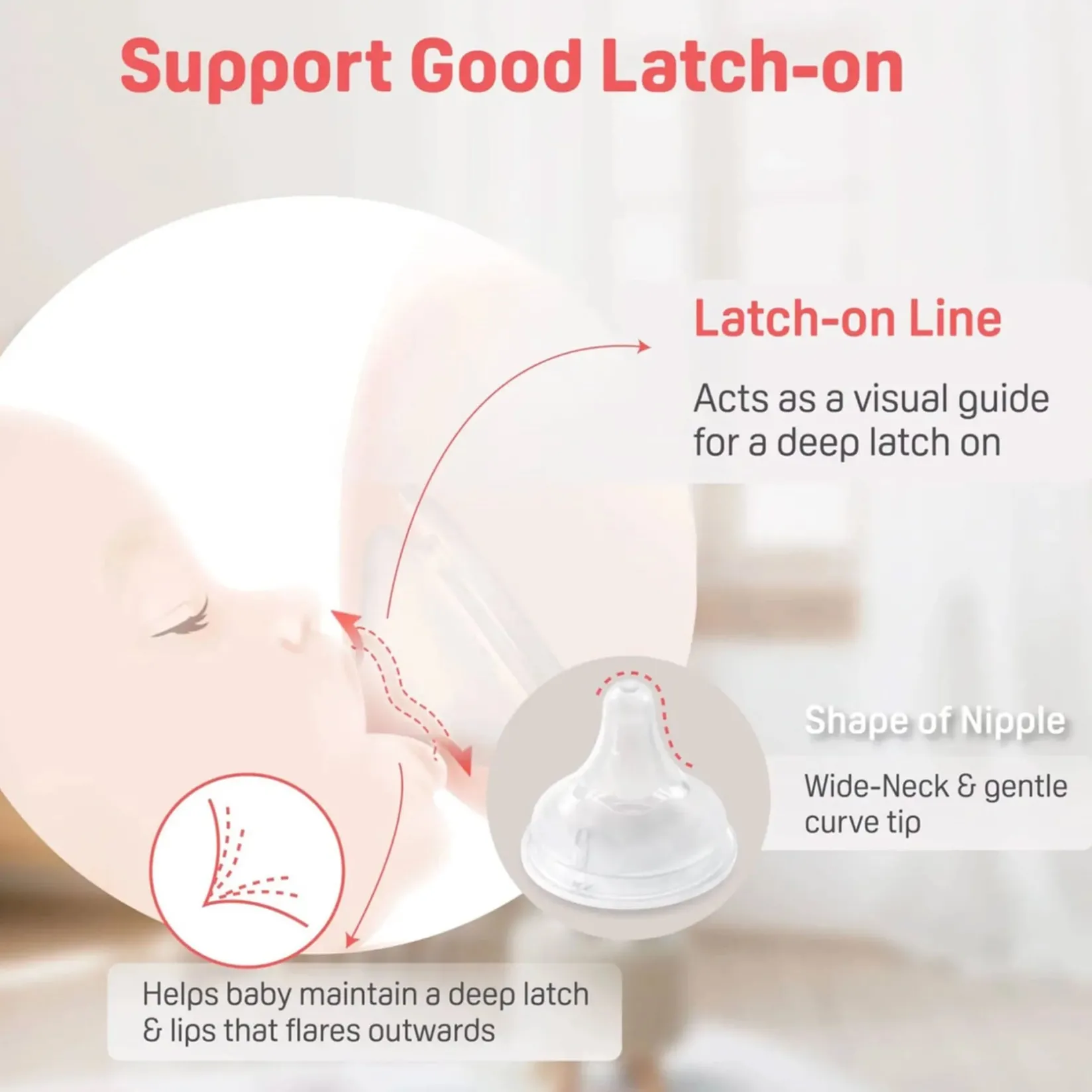 The Breastfeeding Experience bottle and nipple were developed with the goal of smooth use in combination with breastfeeding and allowing babies to drink with the same mouth movements as breastfeeding. It supports a baby’s proper latch and smooth tongue movements, making breastfeeding a comfortable experience. Latch-OnĀ®: the wavy line on the nipple indicates how deep a baby should latch on. This line serves as a guide for moms and dads who are unsure how deep their baby should latch on. This Latch-OnĀ® guides babies to a proper latch and supports smooth breastfeeding. Latch-on refers to the moment a mother places her nipple in her baby’s mouth just as the baby begins to latch on to the mother’s nipple. Once latch-on is successful, your baby and you can start breastfeeding smoothly.