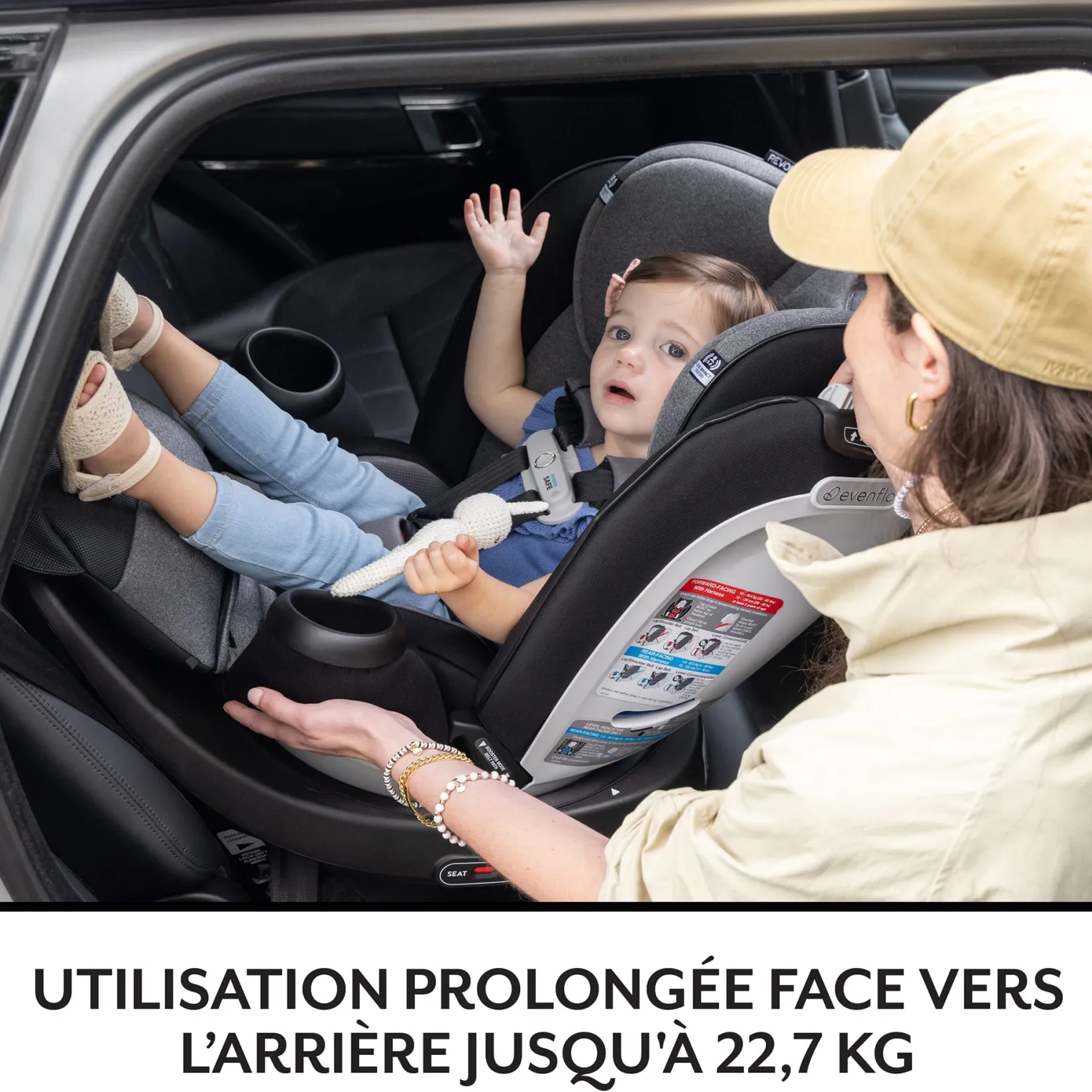The revolution just got extended! The Evenflo® Gold Revolve360™ Extend All-in-One Rotational Car Seat with SensorSafe™ offers the extended security of rear-facing all the way up to 50 lb. Child safety experts say the longer your child remains rear-facing, the better, and the Revolve360 Extend is here to help with peace of mind all the way around. A spin-off of the Revolve360, America’s bestselling rotating car seat, the Revolve360 Extend offers one-hand, 360° rotation that makes it easy to get your child in and out of the car. But a 360° rotating car seat is just the beginning. You’re looking for a safe car seat — and the smart car seat choice is a connected car seat. The Evenflo Gold Revolve360 Extend will help put your mind at ease when it comes to child car seat safety, featuring SensorSafe to connect you to your little one from the backseat. While your eyes are focused on the road, integrated SensorSafe technology alerts you in real-time to four potentially unsafe conditions from your child’s car seat via your phone: unexpected chest clip unbuckling, temperature too hot or too cold, child unattended in the car, and child seated too long. Install the seat just once for rear-facing and forward-facing modes of use — no need to remove the seat in order to make the switch. Sure360™ Safety Installation System with LockStrong™ and Tether360™, plus a handy bead-level indicator for leveling in seconds, make your one-time installation safe, secure and simple. The best swivel car seat is one that lasts! The Revolve360 Extend is the only car seat you’ll ever need, growing with your child with 3 modes that adapt to every stage: rear-facing (4 to 50 lb), forward-facing (22 to 65 lb) and booster (40 to 120 lb). This innovative car seat also comes with a zip-on, ergonomic leg rest to add comfort for growing legs. On-the-go recline means you can adjust the car seat to the perfect angle without having to uninstall or bother your child. This is the crème de la crème of swivel car seats. Offering good looks and ease at every turn, the Evenflo Gold Revolve360 Extend features our most sophisticated fabrics and elevated touches to finish off your bold moves in style. Join the revolution! At Evenflo, we go above and beyond government standards to create car seats that are safe. The Evenflo Gold Revolve360 Extend meets or exceeds all applicable federal safety standards. It is structural integrity tested at energy levels approximately 2x the federal crash test standard, and it is side-impact tested, rollover tested and temperature tested.