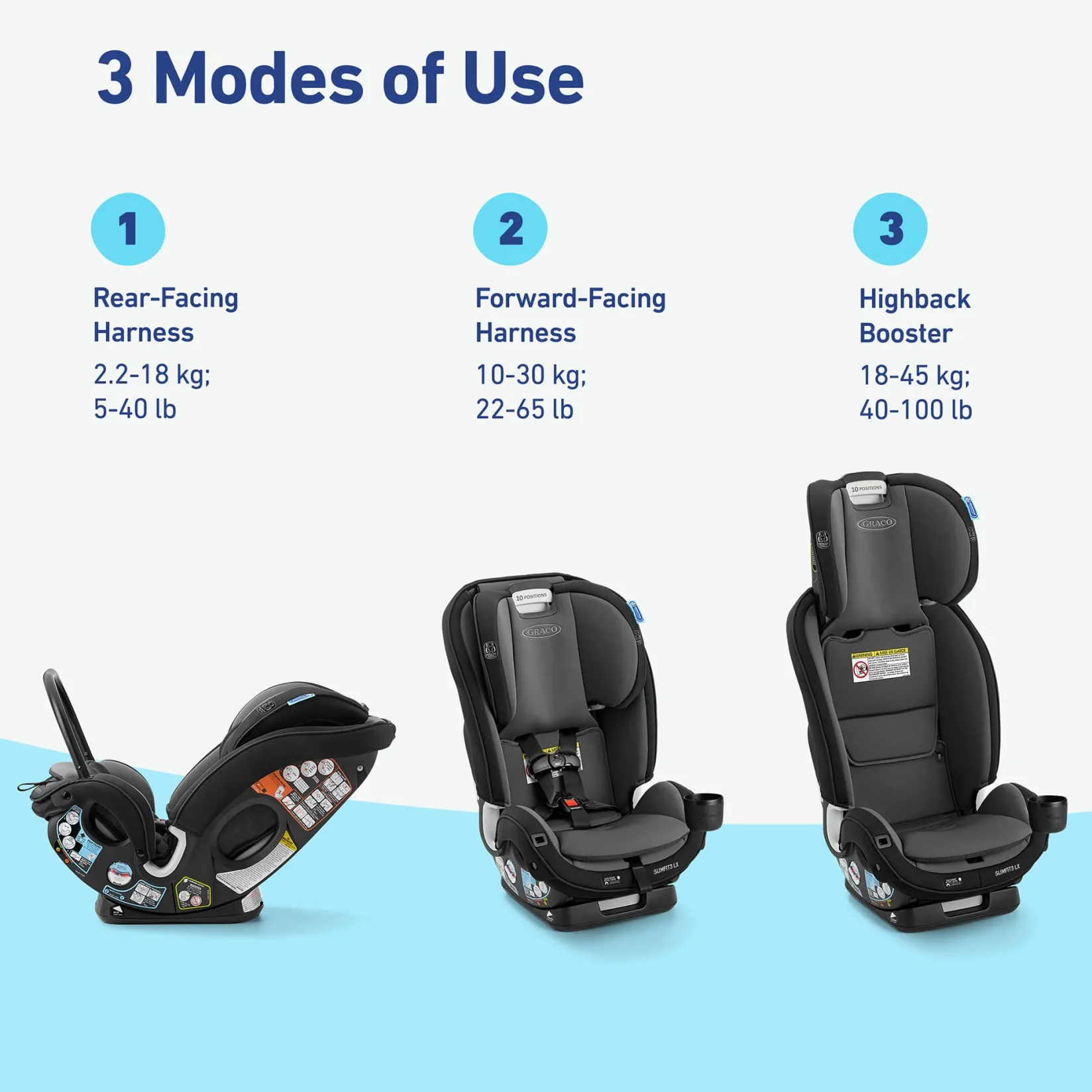 -3-in-1 car seat grows with your child from rear-facing harness (2.2 kg to 18 kg; 5-40 lb) to forward-facing harness (10 kg to 30 kg; 22-65 lb) to highback booster (18 kg to 45 kg; 40-100 lb)