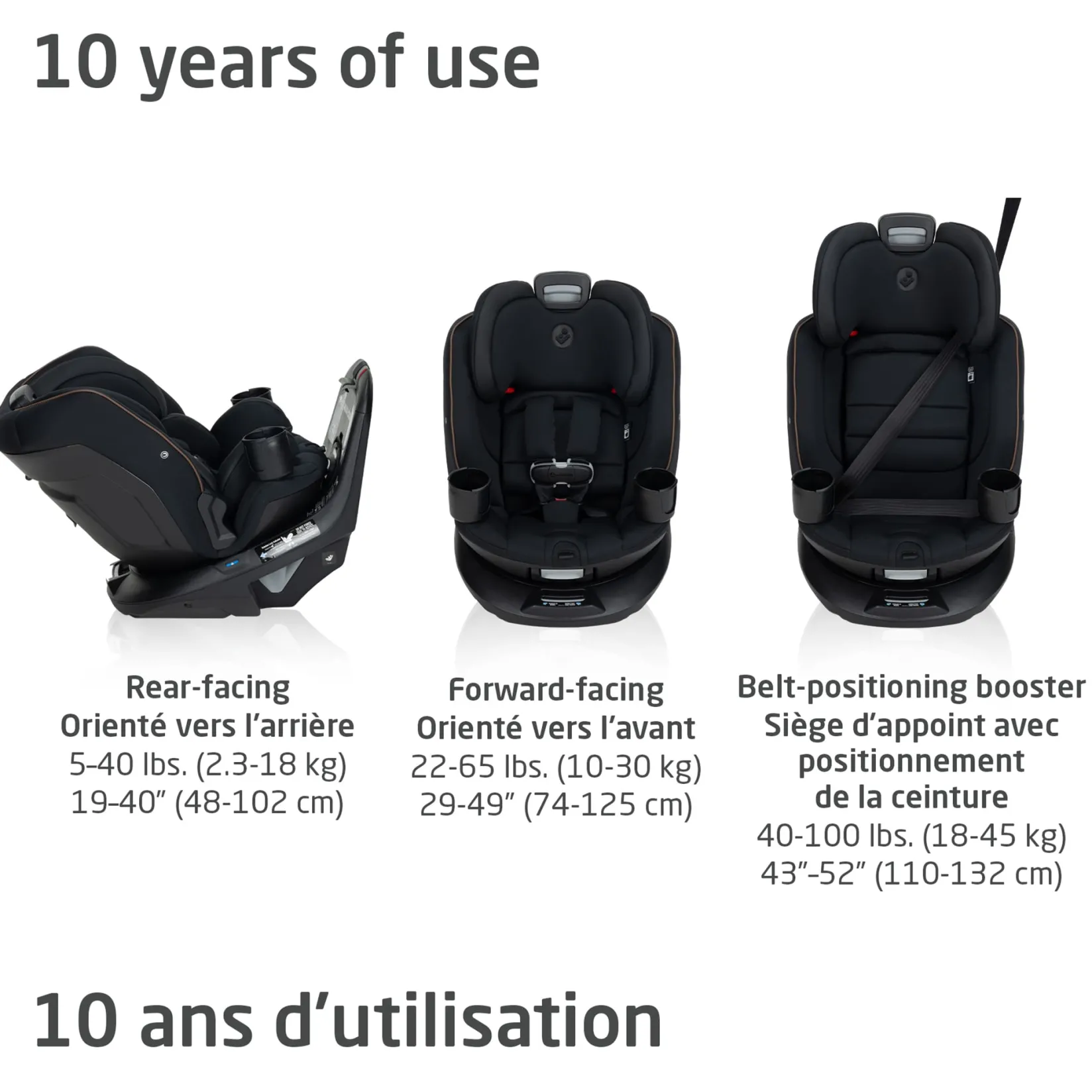 Andi 360° is made to evolve with your child as they grow (and grow), from birth to ten years. Travel with confidence in all 3 modes: rear-facing (5–40 lbs., 19”–40”), forward-facing (30–65 lbs., 34.4”–49”), and belt-positioning booster (40–100 lbs., 43.4”–52”).