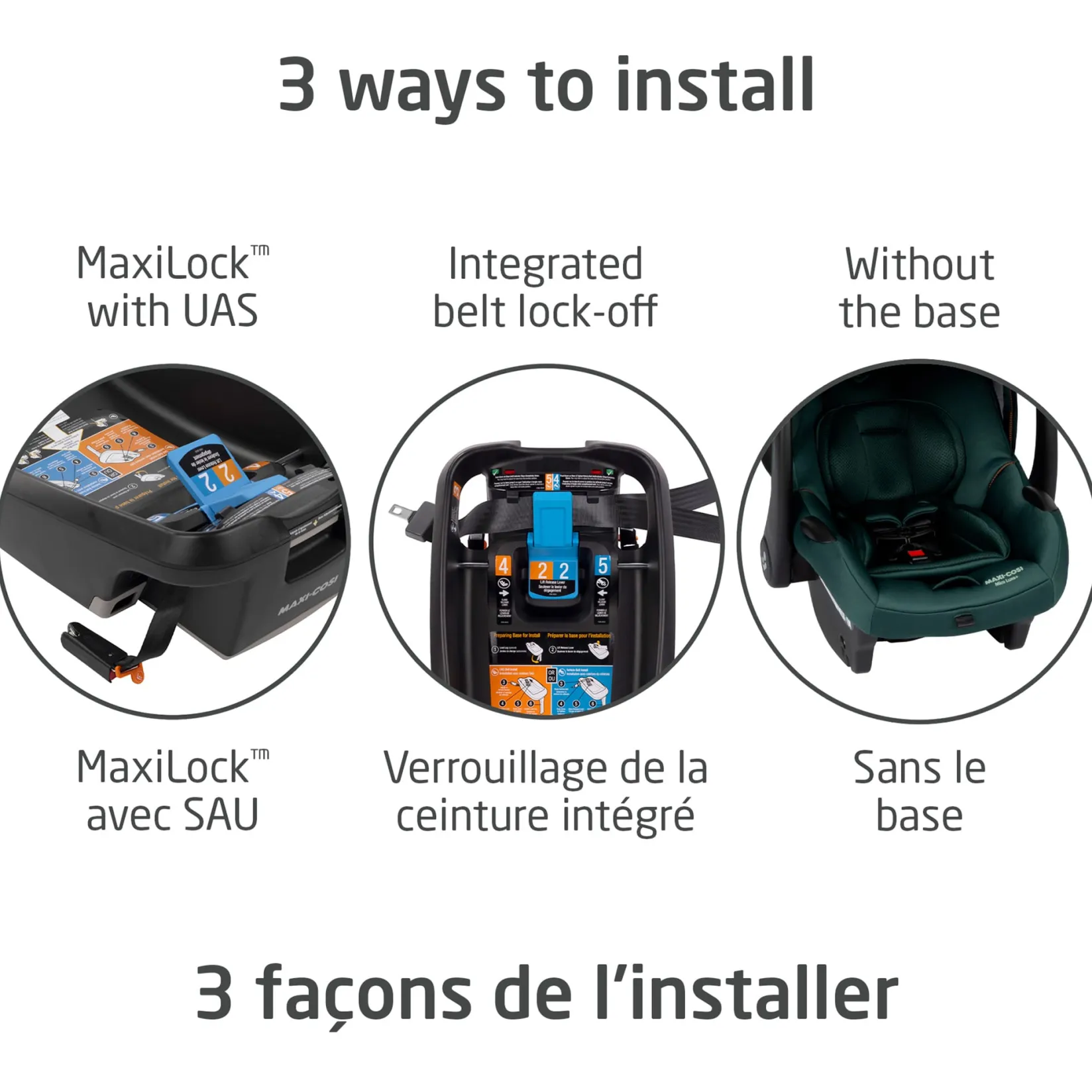 – Convenient stay-in-car base featuring MaxiLock™ technology with 3 adjustable positions