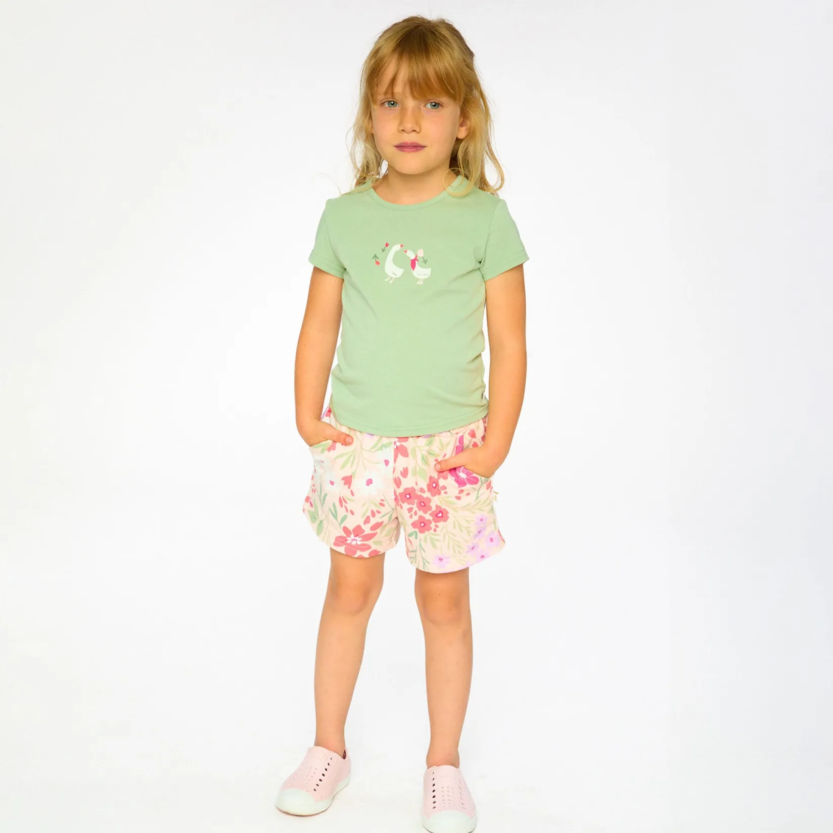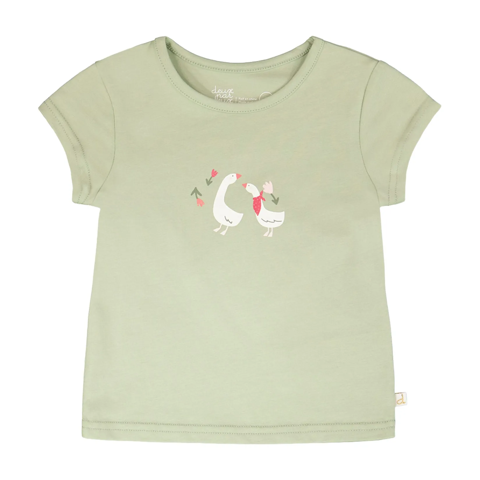 Our organic cotton jersey t-shirt in light khaki green is a sweet everyday essential with a playful twist. This top features short sleeves, a round neckline, and a front graphic of two little geese for extra charm. Soft and stretchy, it’s ideal for girls and baby girls, easy to coordinate with bottoms from our “Little Meadow” collection.