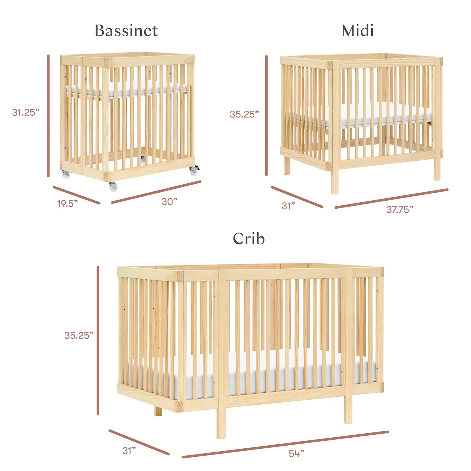 – ALL-STAGESĀ® 8-in-1 convertibility with 8 conversions across 3 sizes: bassinet, midi crib, midi toddler bed, midi daybed, full-size crib, full toddler bed, full daybed, and junior bed.