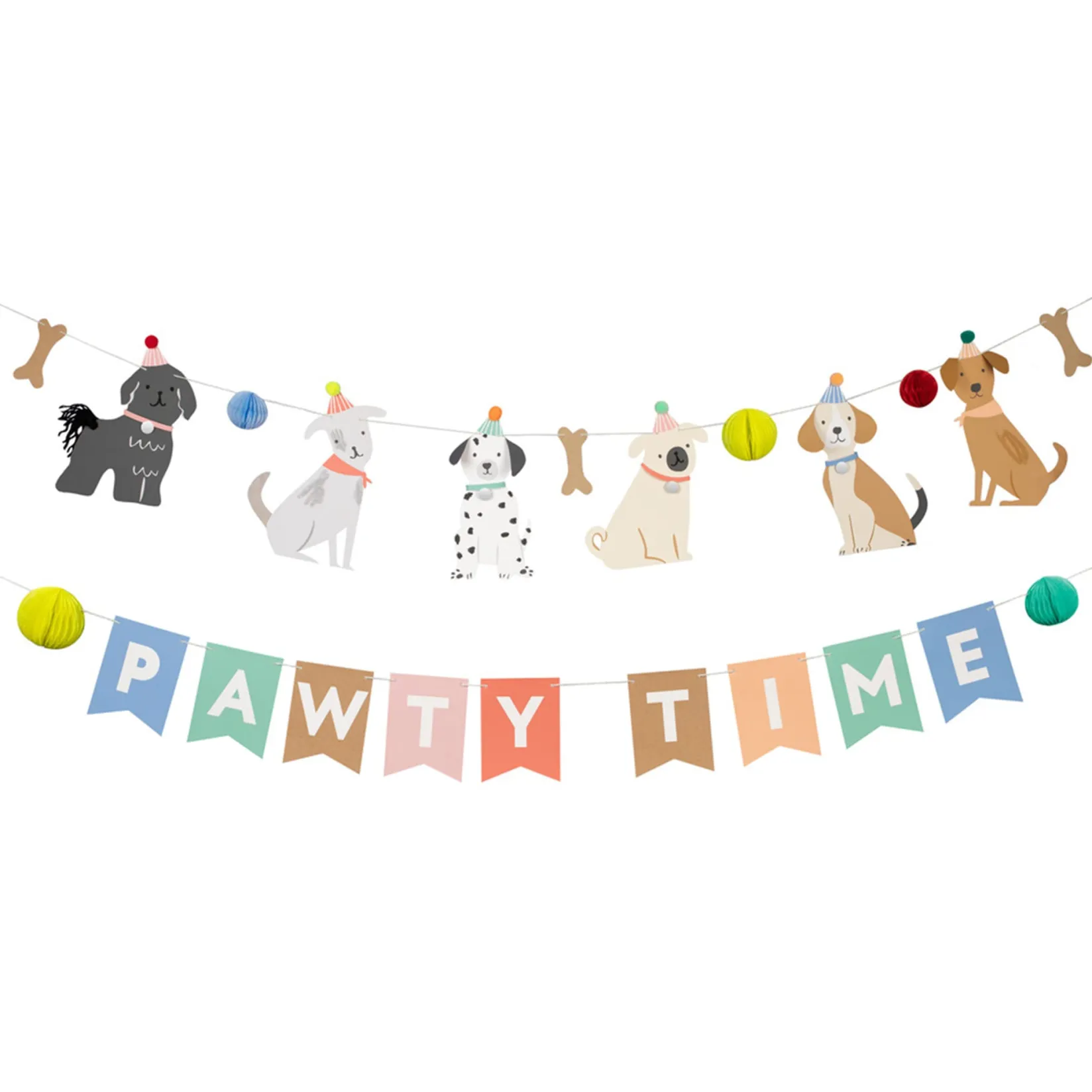 -2 pre-threaded garlands. One with puppy pennants with folded ears, bones and honeycomb balls. The second with honeycomb balls and letter pennants.