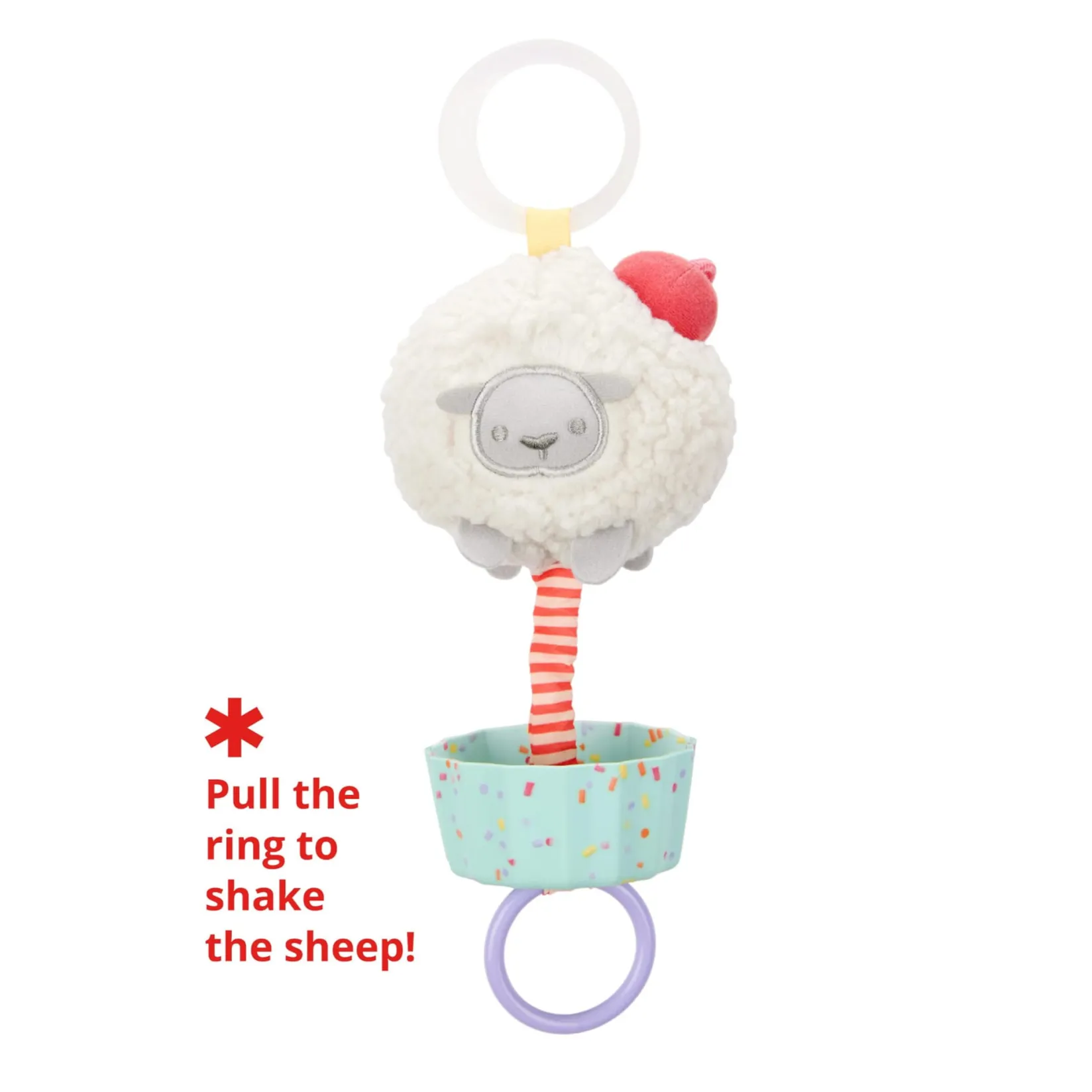 Featuring a tactile mix of fleecy baa-nilla “frosting” and soft silicone, our Sweet Sheep cupcake stroller toy offers multi-sensory play and exploration for baby wherever you go. Baby getting fussy? Just pull the ring and watch the sheep shake and vibrate for extra entertainment.