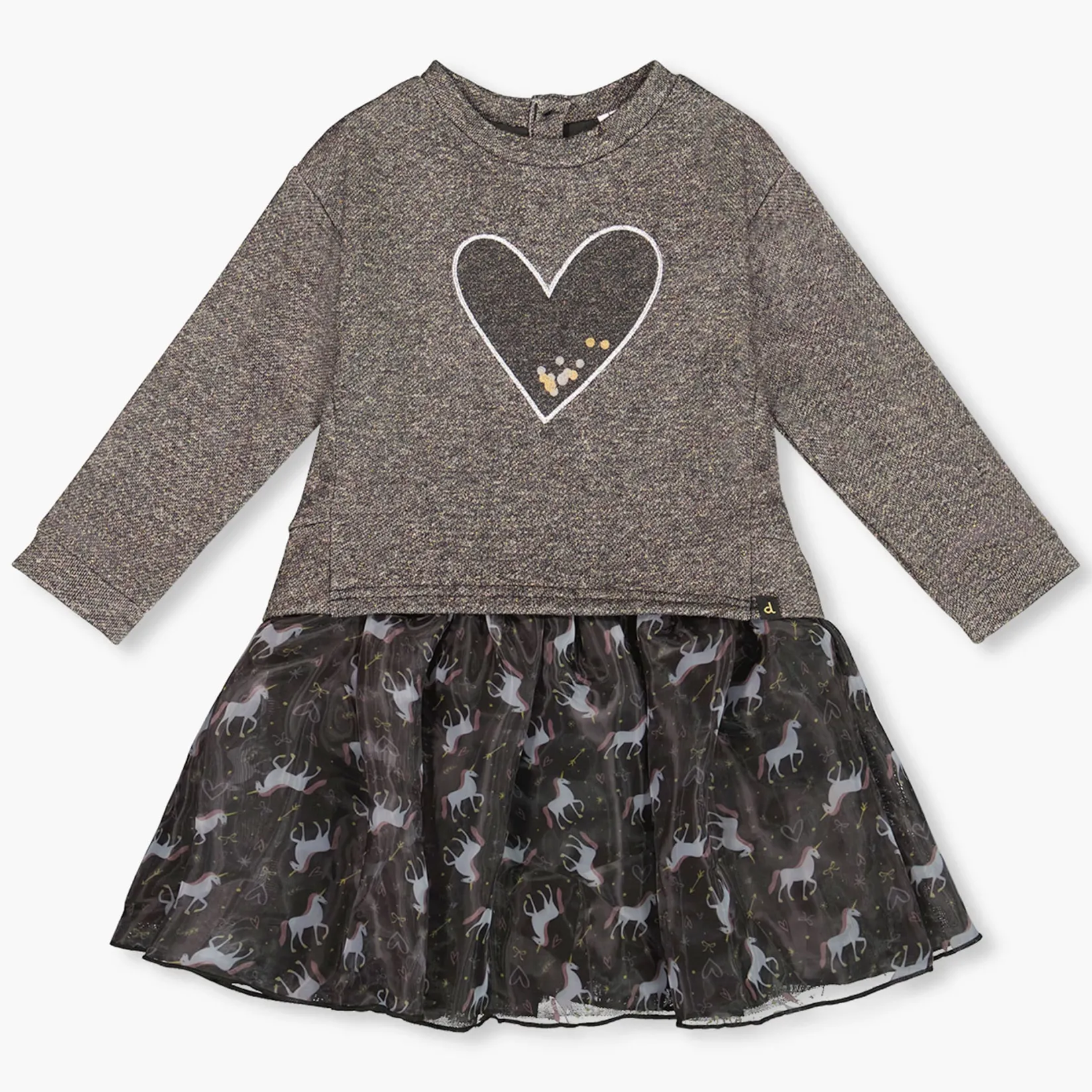The Bi-Material Dress Dusty Pink With Mesh Skirt and Unicorn brings a magical twist to casual dressing. This dreamy sweatshirt-style dress features a soft french terry bodice with a sparkly unicorn print, and a flared mesh skirt with an allover polka dots print for extra flair. With a comfy fit and playful style, it’s perfect for parties, school, or weekend adventures.
