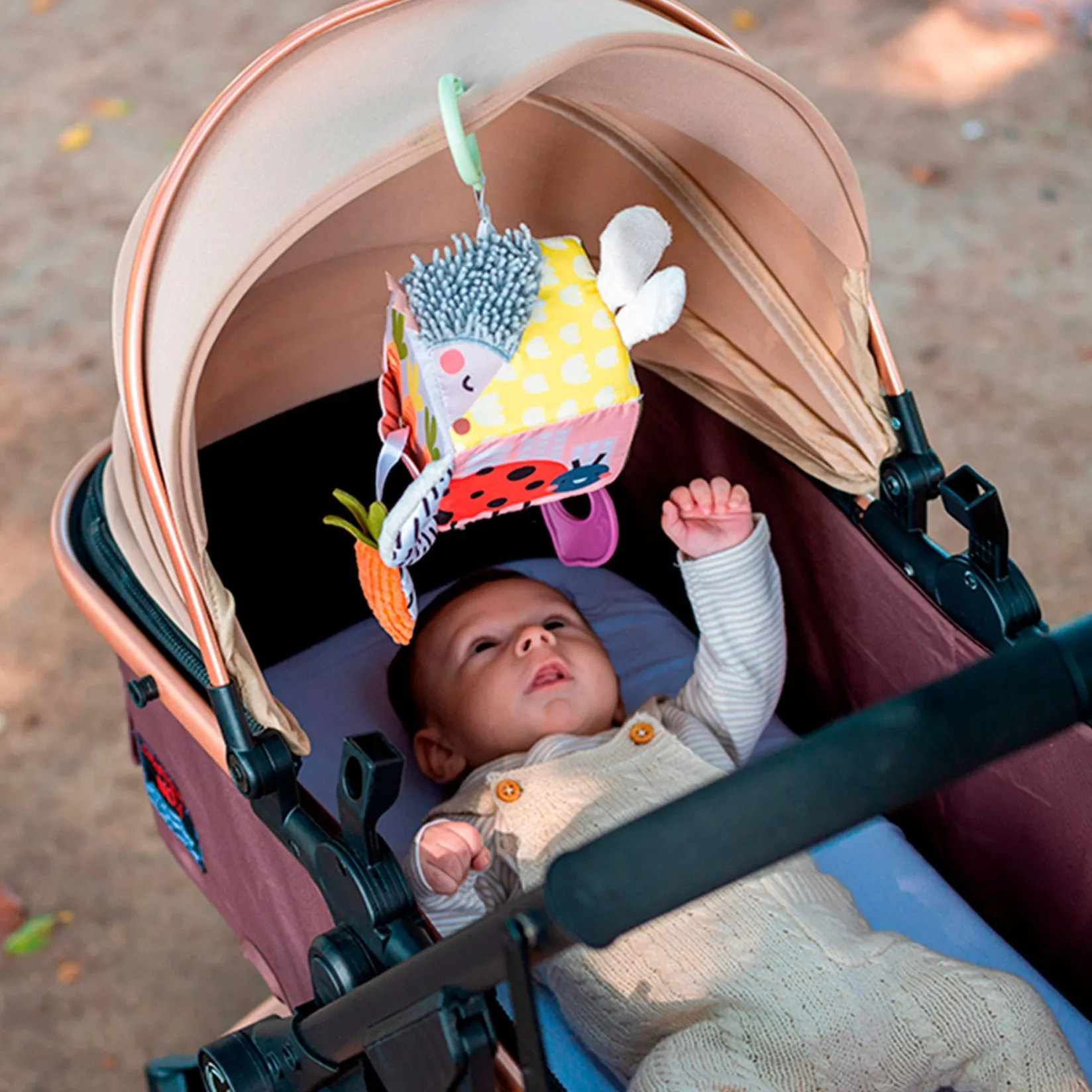– Features a peek-a-boo flower, baby-safe mirror, beet-shaped teething toy, bunny ears that make a crinkling sound , rustling rings, different fabric textures, a carrot crunch and much more.