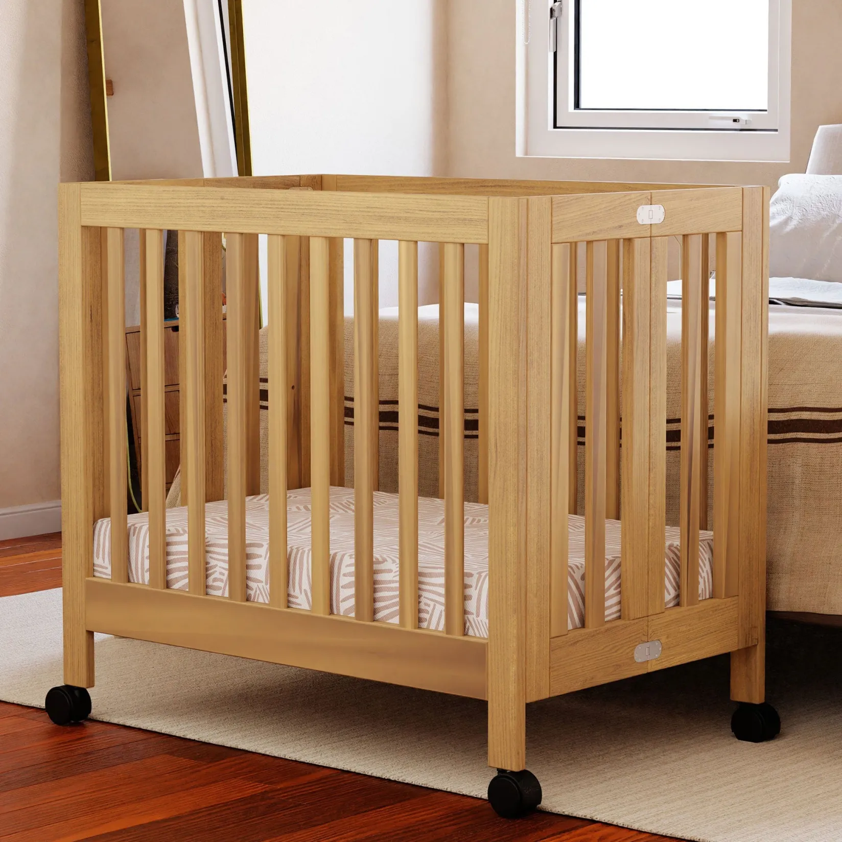 Meet Origami Mini Crib, the portable mini crib designed for modern families. Perfect for urban living or secondary living spaces, the Origami Mini’s petite footprint and rolling feet allow for easy movement throughout the home, and will outlast a bassinet, providing a safe sleeping environment for your growing babe. With a folding mechanism for storage, the sustainable wood construction of the Origami Mini is both durable and lightweight.
