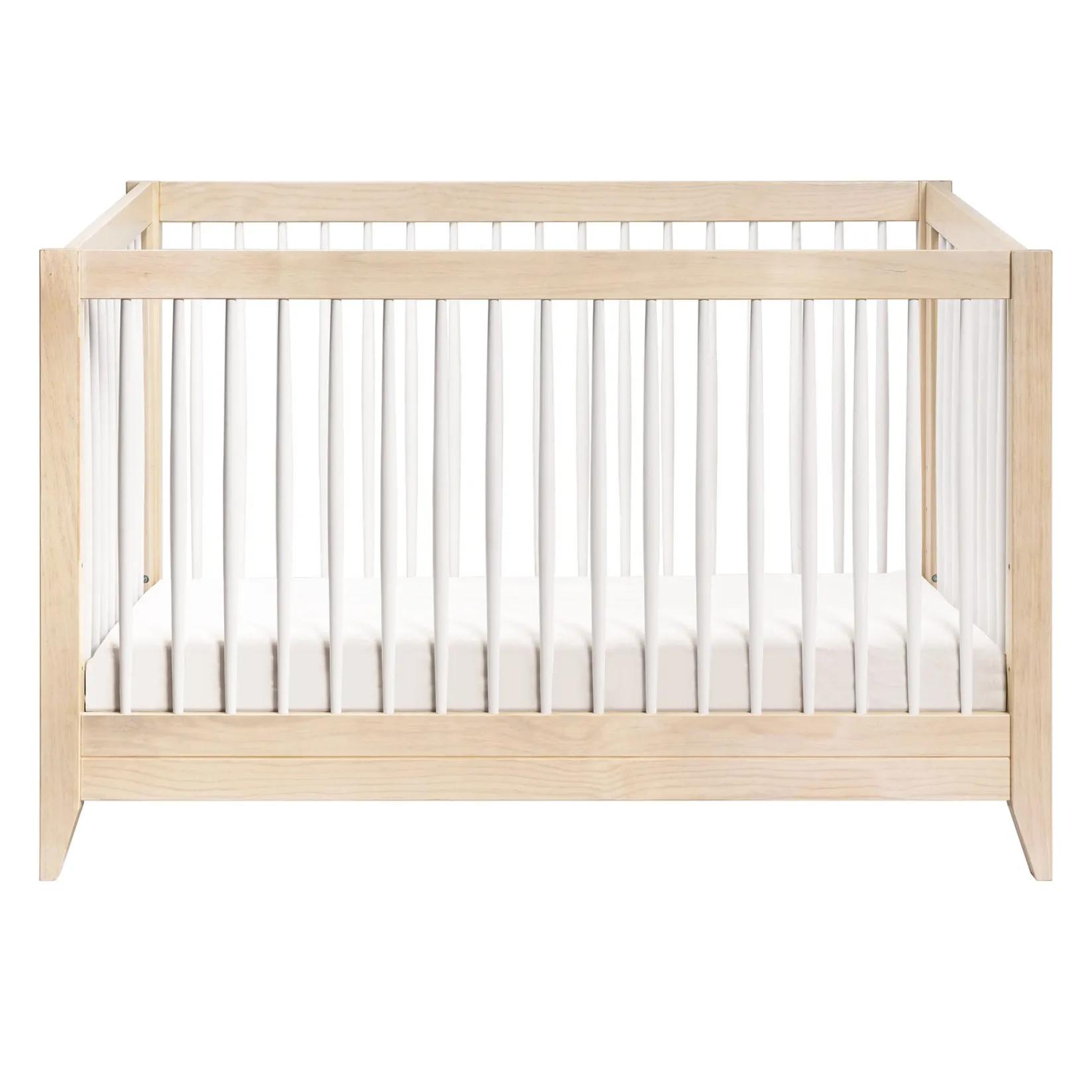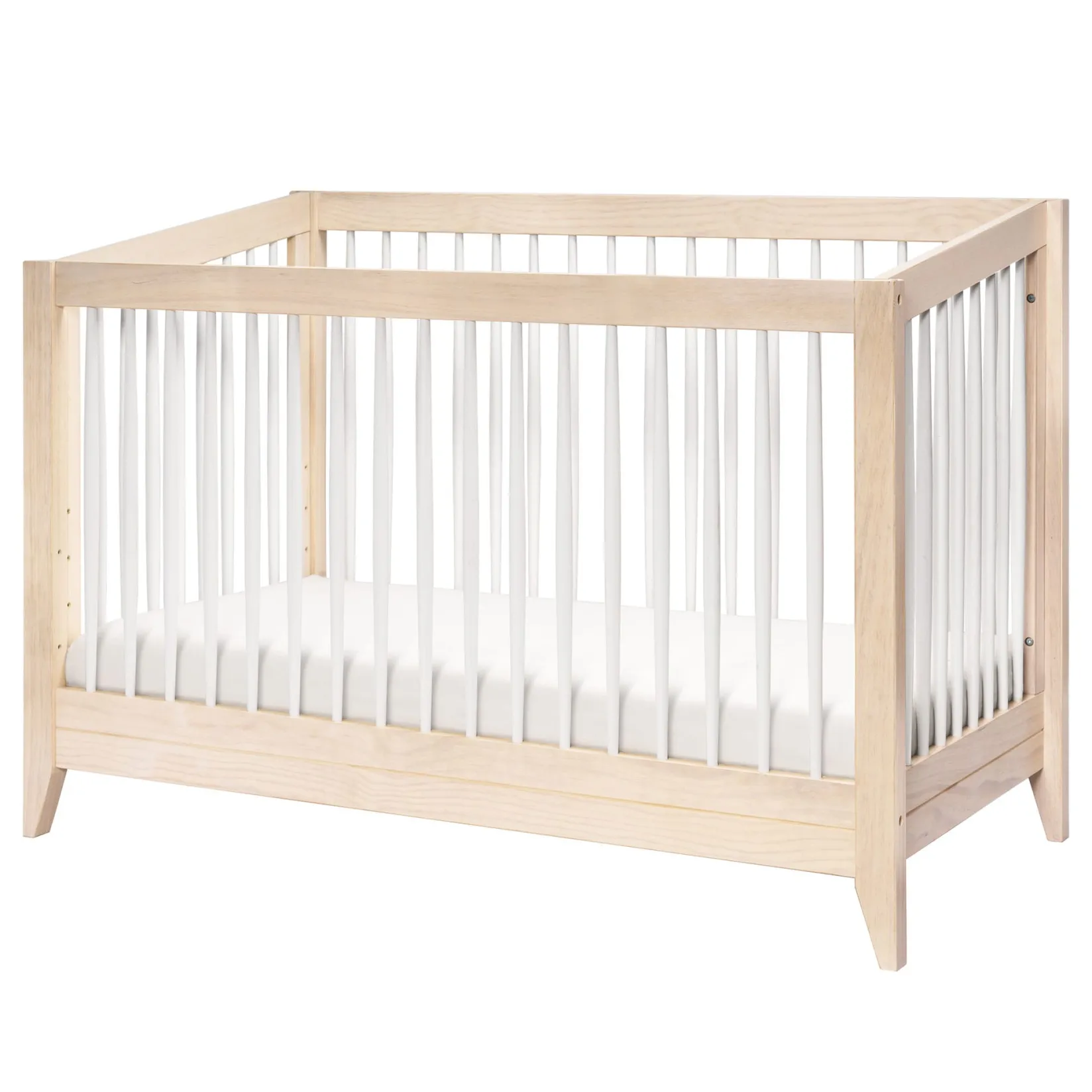 -Playful Timeless Design: Featuring a modern, clean silhouette and classic rounded spindles with a slightly raised back. Flared tapered legs add a playful touch to this sophisticated crib.