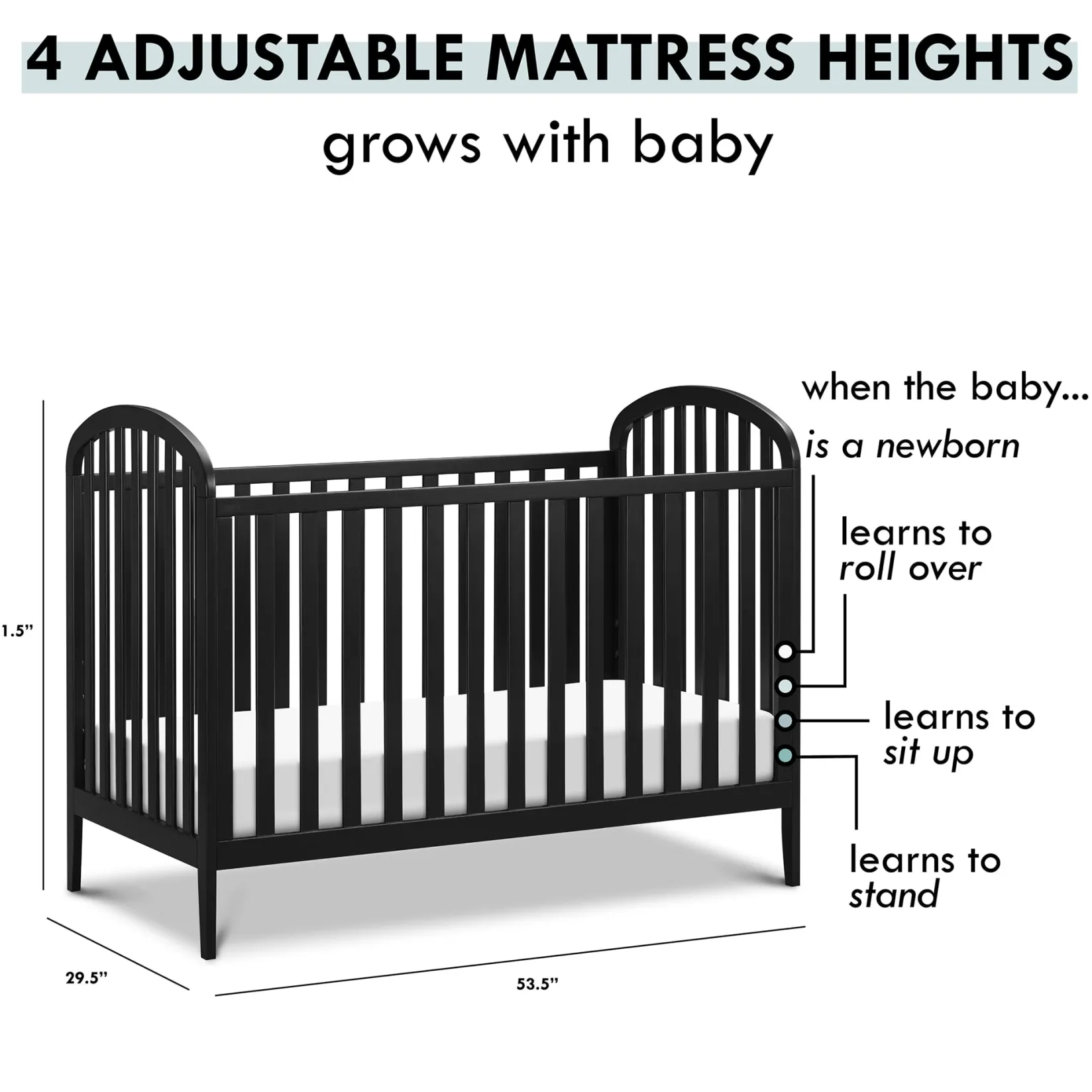 -GROWS WITH BABY: 4 adjustable mattress positions that you can lower as your baby begins to sit and stand. We’ve built this crib to withstand even the most active babies and toddlers and last through your child’s teen years