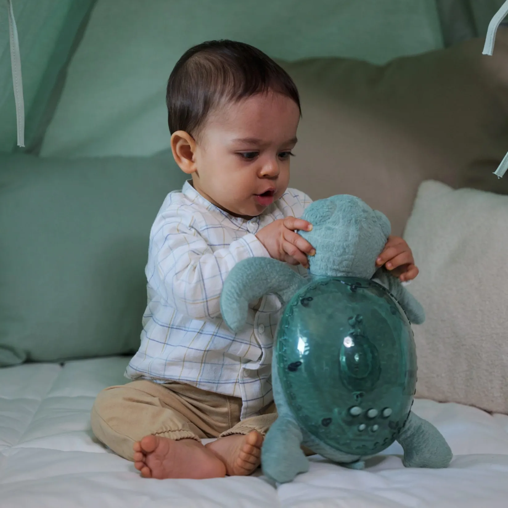 Tranquil Turtle™ Rechargeable – Green is a cute musical turtle, made from 100% recycled polyester fabric and padding, that glows with a soft light and projects moving ocean waves on the bedroom ceiling.