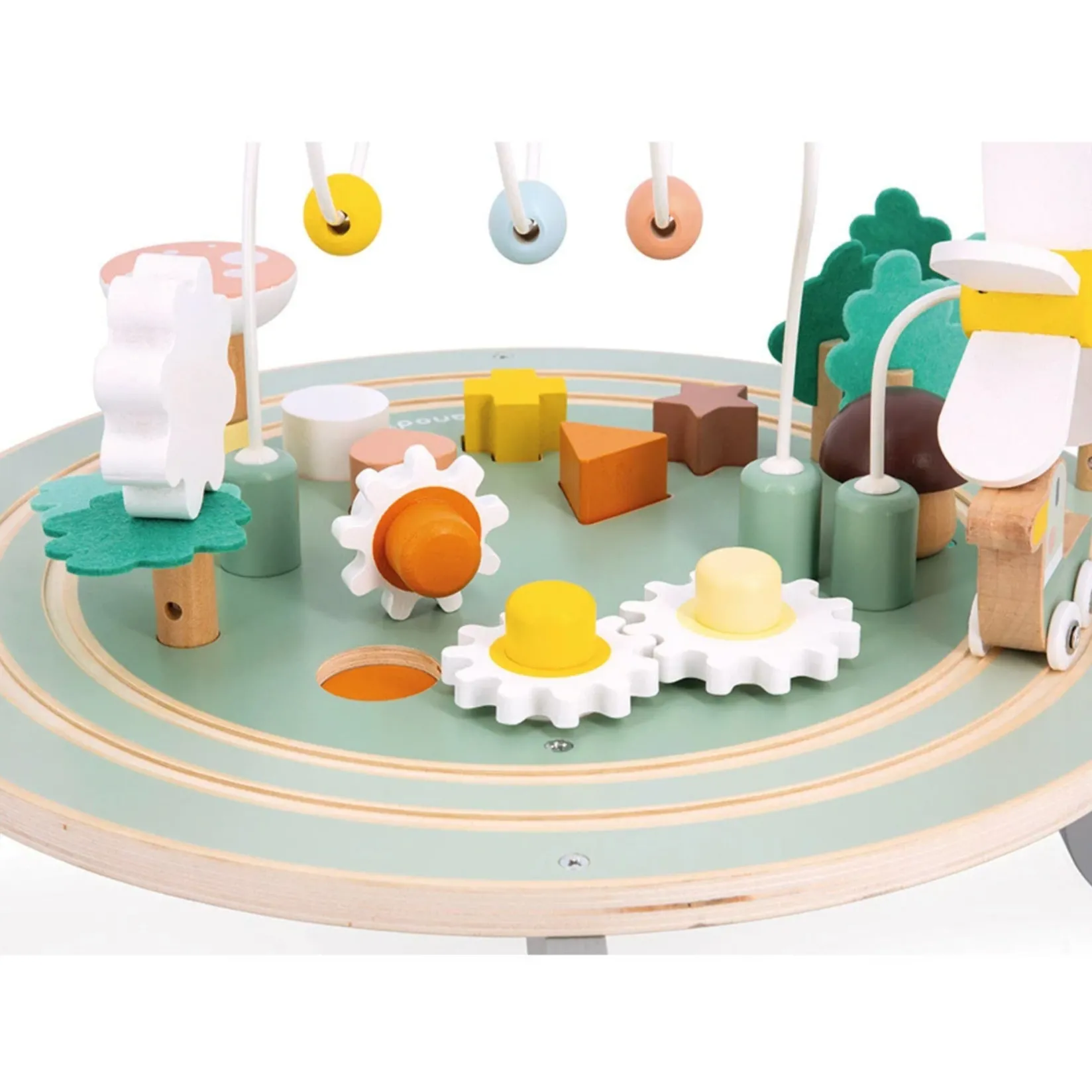 It’s garden exploration time for baby with their cute wooden activity table! With its 9 activities and adjustable height, it is the ideal complete early-learning toy for little ones aged 12 months and over. On the cards: discoveries, motor skills and the awakening of baby’s senses, all in a soft-hued rural world. This multi-activity table boasts: 1 large stackable mushroom, 5 different-coloured slot-in shapes, 1 forest comprising 5 soft felt trees, 1 stackable daisy with a mirror effect, 1 large looping toy, 3 rotating flower-shaped gears, 1 mushroom with sound effects, 2 small ducks that can be pushed around the track around the board’s perimeter and 1 windmill which turns when the ducks pass underneath. This early-years toy adapts to 2 different heights to grow along with baby: the top can be positioned 14 or 22 cm off the ground. The variety of colours, shapes and textures helps stimulate baby’s sight, hearing and touch. They will enjoy curiously manipulating everything on their activity table. With its many little games, simple style that combines natural wood with timeless colours, the durable materials used and its adaptability, this complete baby’s toy is bound to be a winner. Sit around the table with your little one aged 1 year and up and show them the different features, then let them explore and experiment at their own pace! This multi-activity table is made of FSC™-certified wood and is part of our Sweet Cocoon collection.