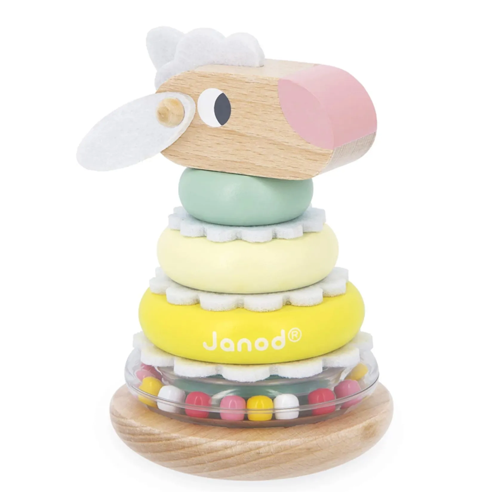 One piece, two pieces… the sheep takes shape again! With this stacking sheep, children as young as 1 year old discover the joys of building, while developing their motor skills and hand-eye coordination. The child gradually assembles each piece: the transparent ring filled with colorful beads, the wooden rings, the felt elements to insert, and finally the sheep’s head. Once the toy is fully stacked, they can shake it to make the beads move inside the ring, adding a sound and sensory dimension to the game. But that’s not all! The sheep also transforms into a roly-poly toy thanks to its rounded base: it rocks gently without ever falling over. An activity that extends the fun! This stacking sheep is from the Zigolos range: a joyful and colorful collection with playful shapes, designed to awaken the senses and accompany toddlers in their first discoveries. This developmental toy is made with FSC™ certified wood and water-based paint.
