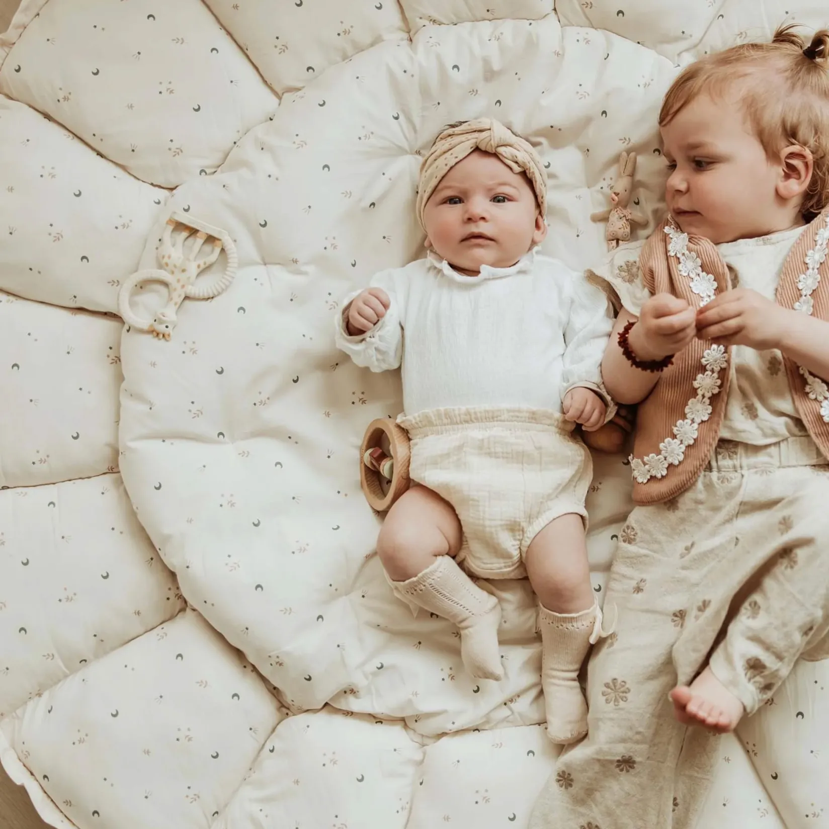 – To switch from playmat to babynest/storage, gently pull the strings to raise the petals