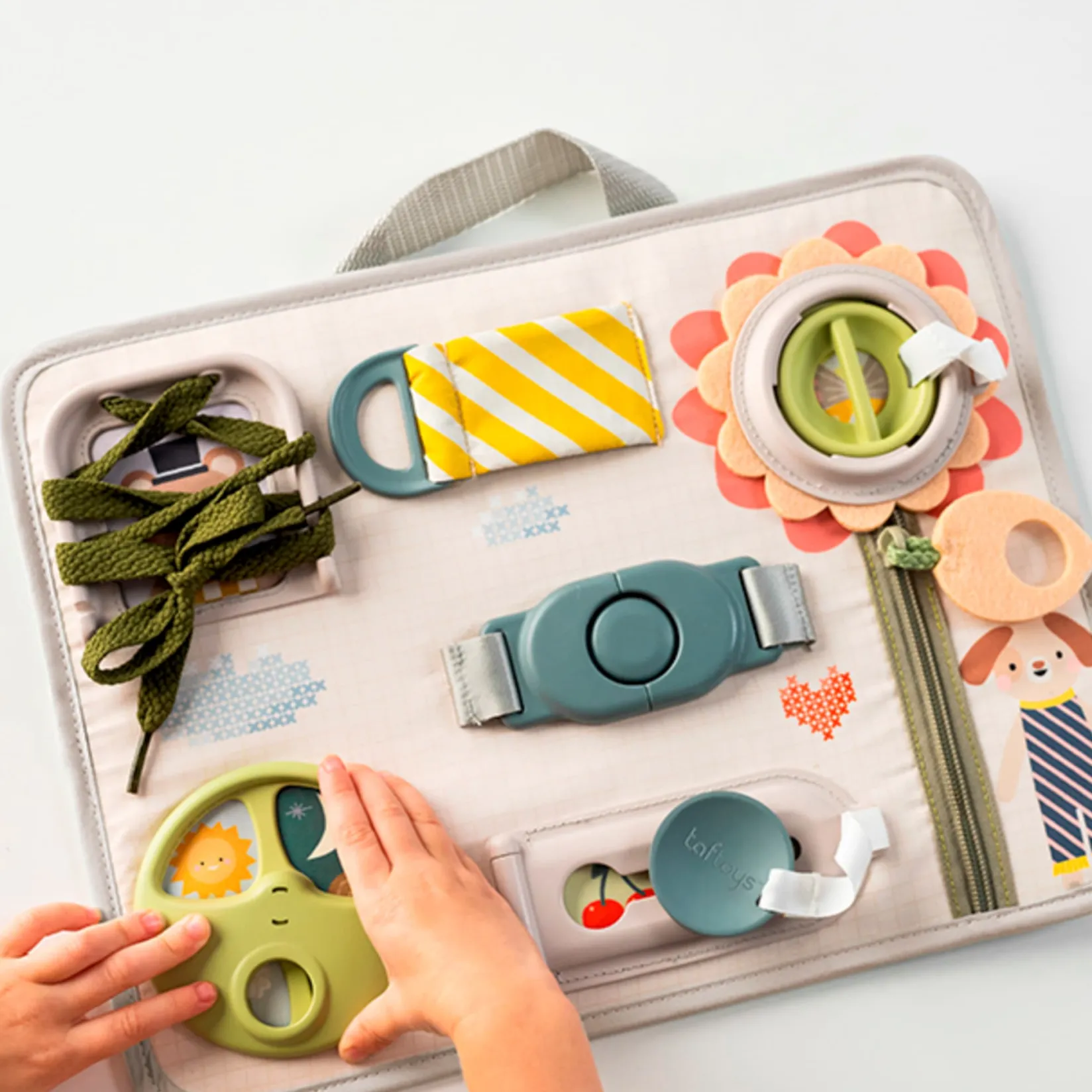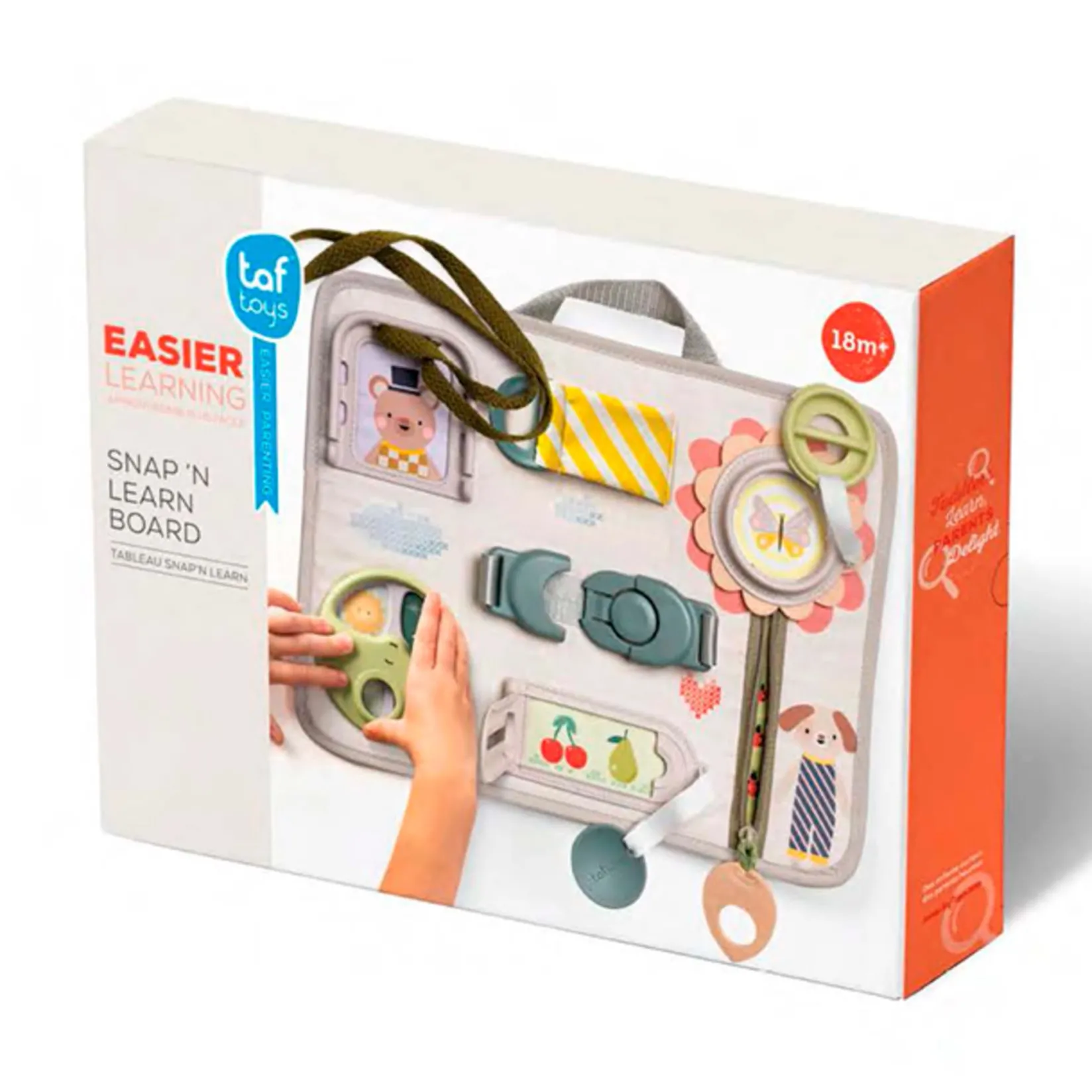 The Snap ‘n Learn Board is an interactive toy for toddlers 18 months and up. It features laces for tying with a peek-a-boo bear, a rotating discover disk with a peek-a-boo flower and  squirrel, and a twist lock revealing a peek-a-boo butterfly. The central buckle helps toddlers practice motor skills and explore sound reactions. Additionally, the zipper with a leaf and the peek-a-boo  sliding snap promote motor skills and understanding of cause and effect.