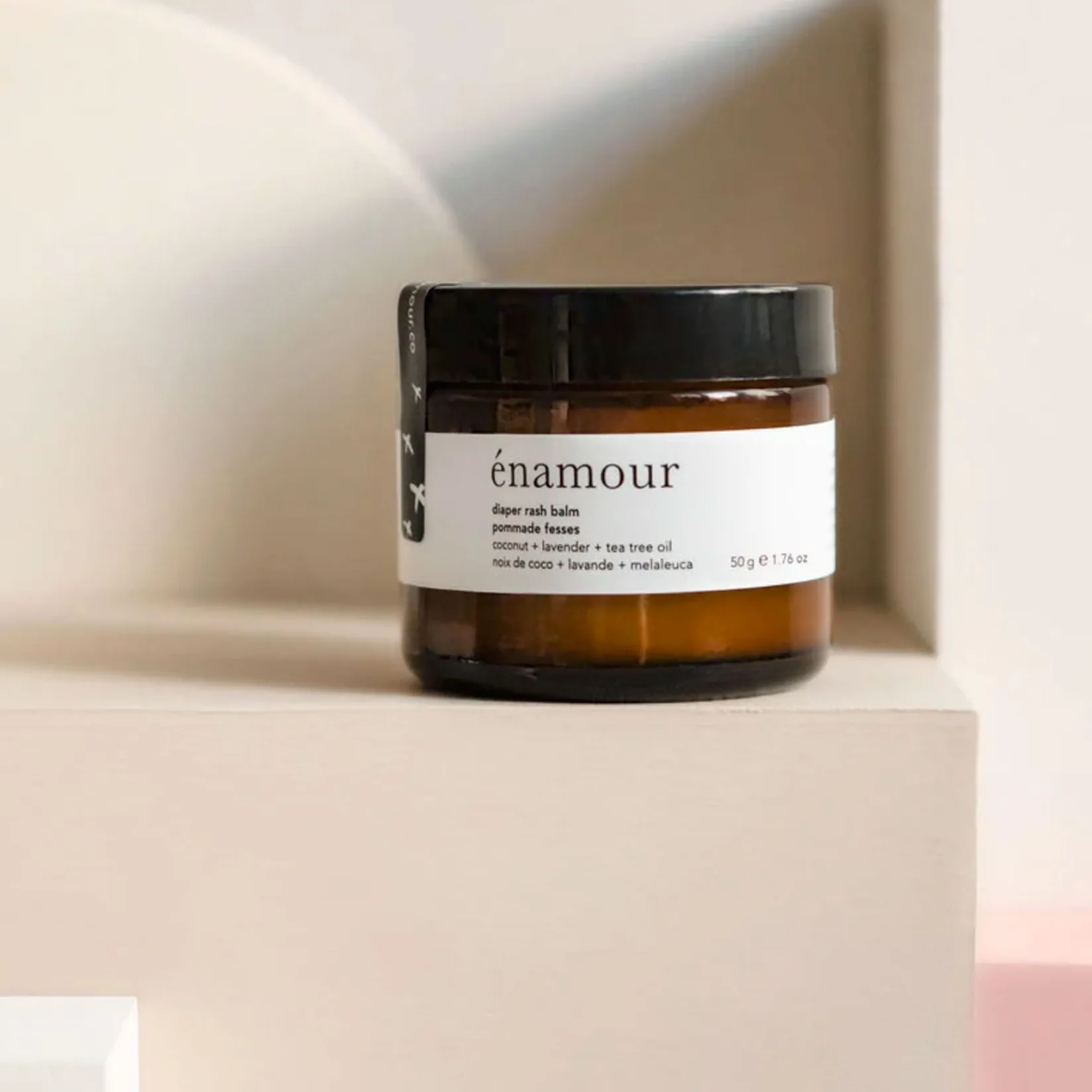 Énamour diaper rash balm is made from a base of natural coconut oil, infused with the healing properties of neem oil, soothing lavender oil and a touch of antibacterial tea tree oil. Use it generously to soothe red bottoms after a diaper change. And yes, our diaper rash balm is compatible with cloth diapers.