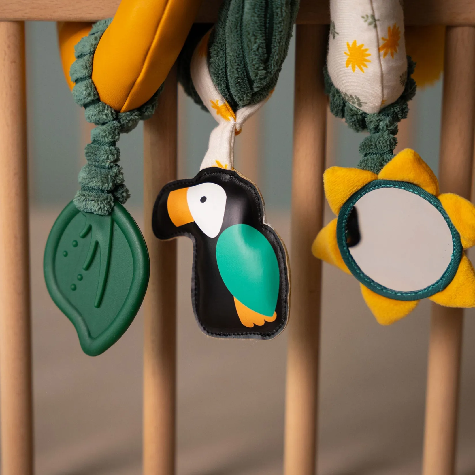The Little Big Friends activity spiral will amuse babies when in a stroller. With the curiosity triggered by the activity spiral, babies’ senses are enhanced. Playful hanging toys are included to explore fun activities: animal maracas, a squeaker, a mirror, or a teether.