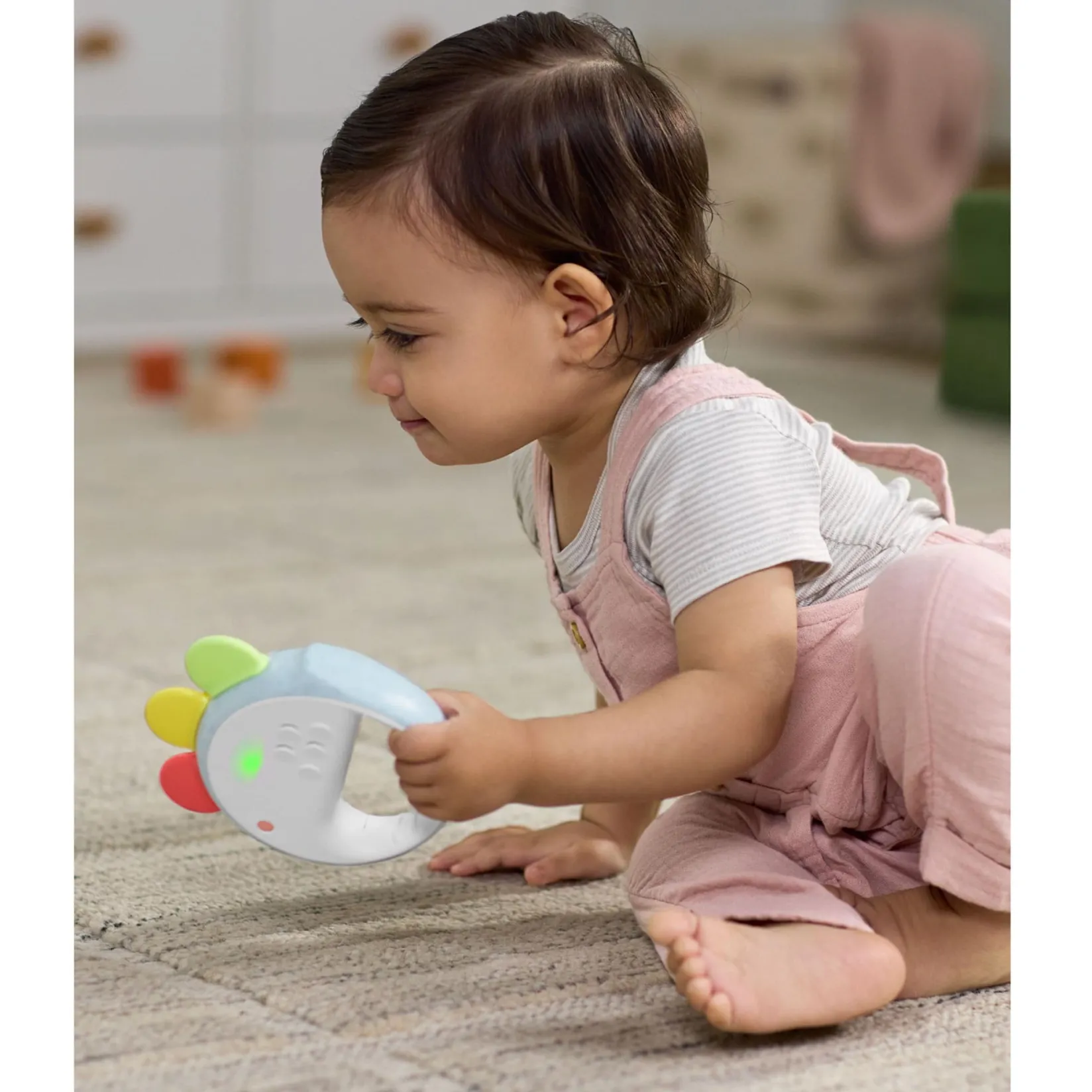 Chick it out! Shake up playtime with our cute musical baby toy. Part tambourine, part keyboard and totally fun, three modes of play plus 20 fun features make this a must-have toy for mini musicians. Filled with fun chicken sound effects, music notes, cheerful songs and multicolored lights, little ones will love to create a concert to cluck about!