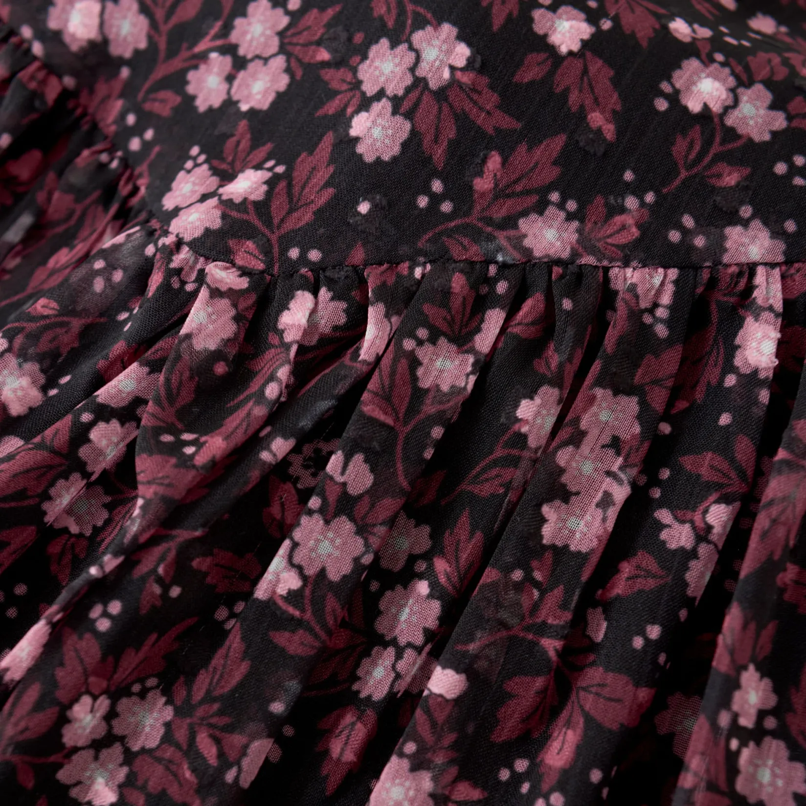 Floral dress from Creamie. The dress has a round neck and long, wide sleeves with elastic in the sleeve opening. From the chest, the dress goes into the skirt, which gives a good width and fine pleats. The dress is made of airy polyester with a cotton underskirt. The dress closes with a button in the back.