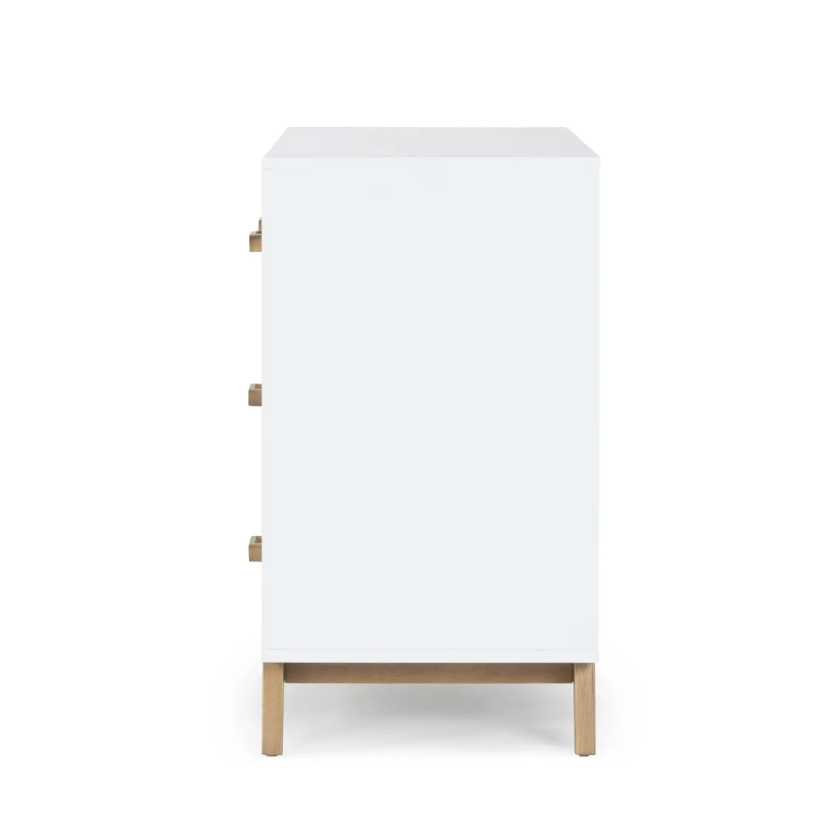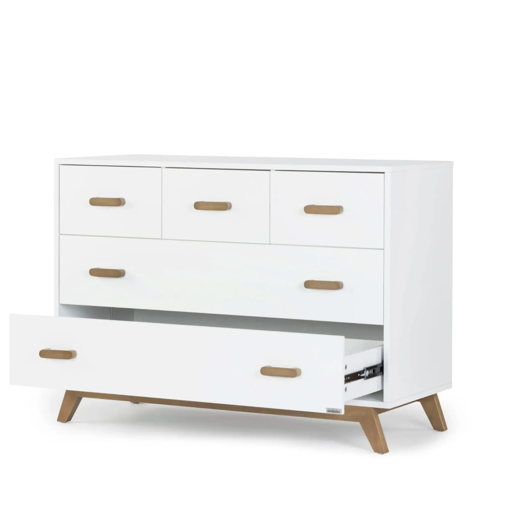 The 48” modern Soho 5-drawer Dresser’s classic style pairs perfectly with the Soho 3-in-1 Crib, or adds a pop of mid-century style to any room on its own. Safe, stable, and strong, with sturdy angled legs and solid wood handles, forged steel support, and a baby-safe painted finish.