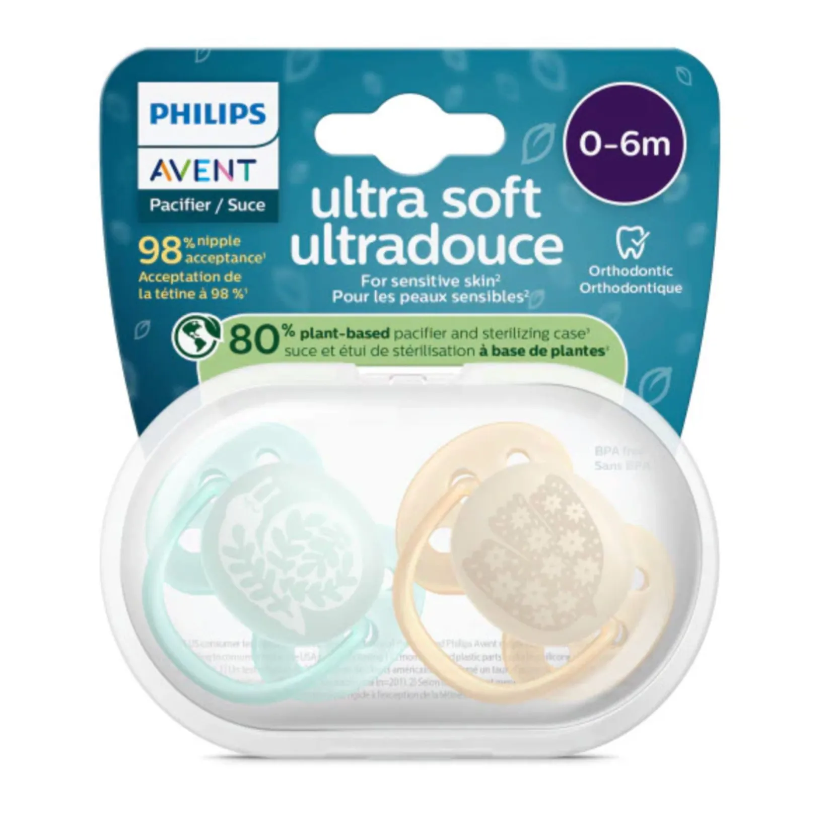 The Philips Avent Ultra Soft pacifier for babies 0-6 months is designed with a soft, flexible shield for fewer skin marks and less skin irritation. This makes it a more comfortable choice for baby.