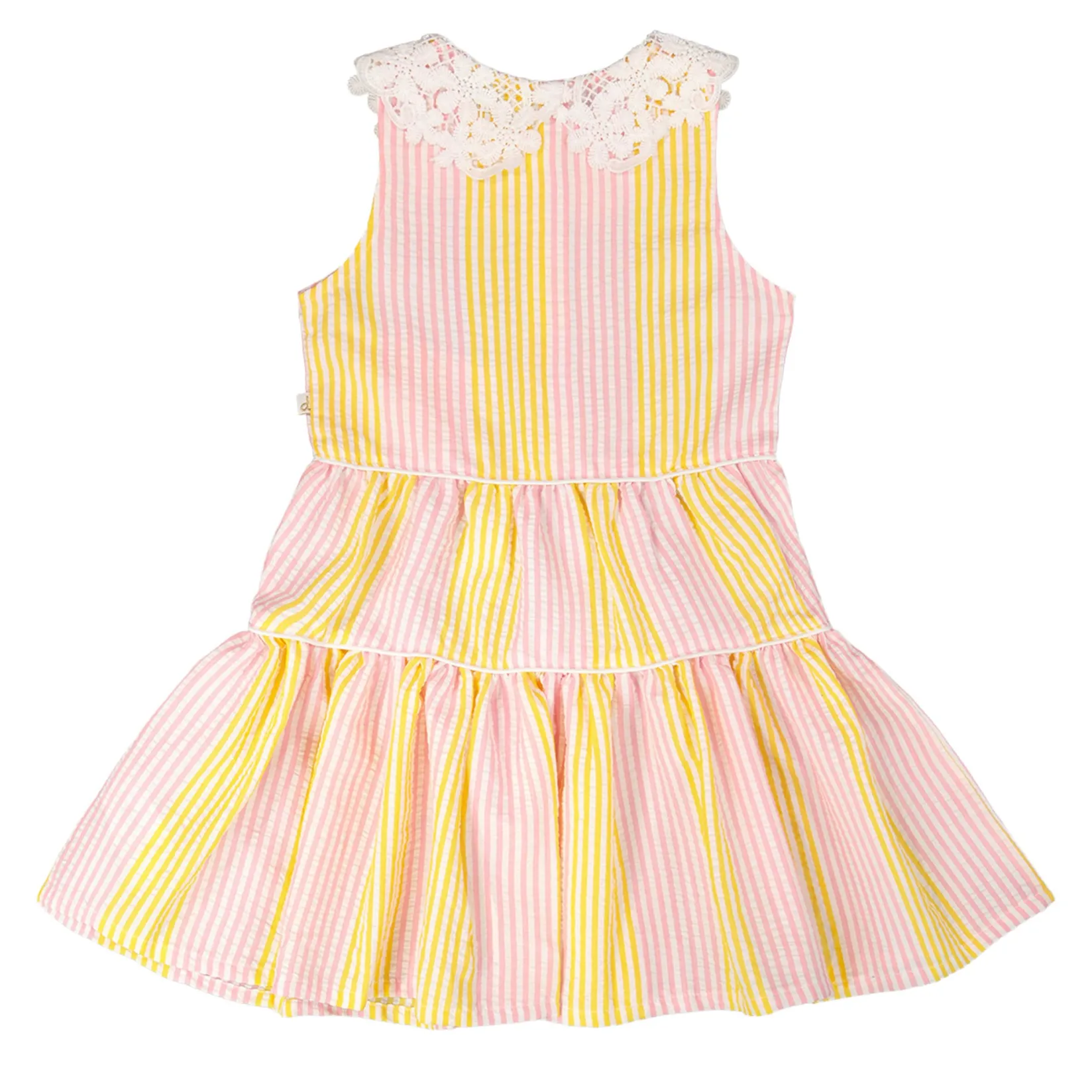 Charming and bright, our sleeveless dress with Peter Pan crochet collar in pink and yellow stripes is a summer essential. This casual dress features flutter sleeves, a scalloped crochet Peter Pan collar, a button-front opening, and a gathered tiered skirt for playful volume. Perfect for sunny days, it pairs beautifully with other pieces from the “Explosion Of Daisies” collection.