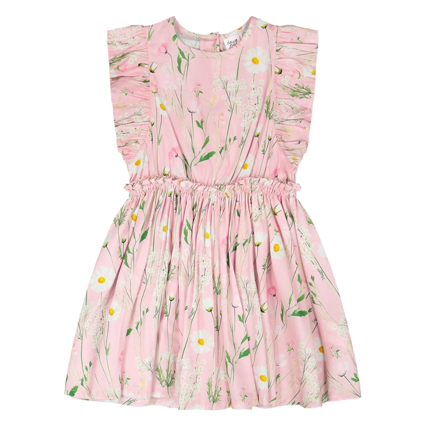 The viscose dress pink with printed flowers is light, playful, and full of charm. This sleeveless dress features delicate ruffles along the shoulders, an elastic waist with ruffles for comfort, and a flared skirt that twirls beautifully. Made from soft viscose with a cotton lining, it feels gentle against the skin and perfect for sunny days.