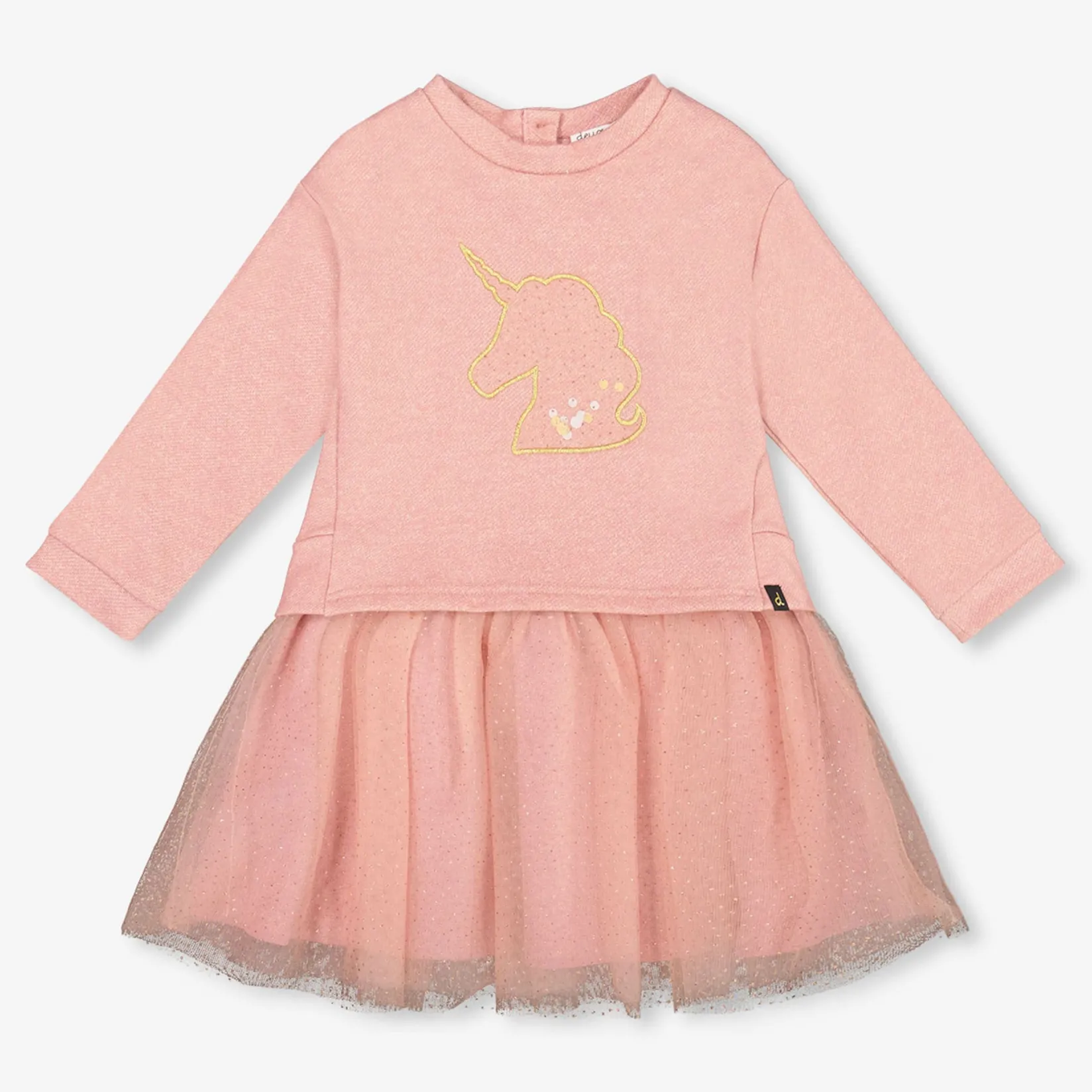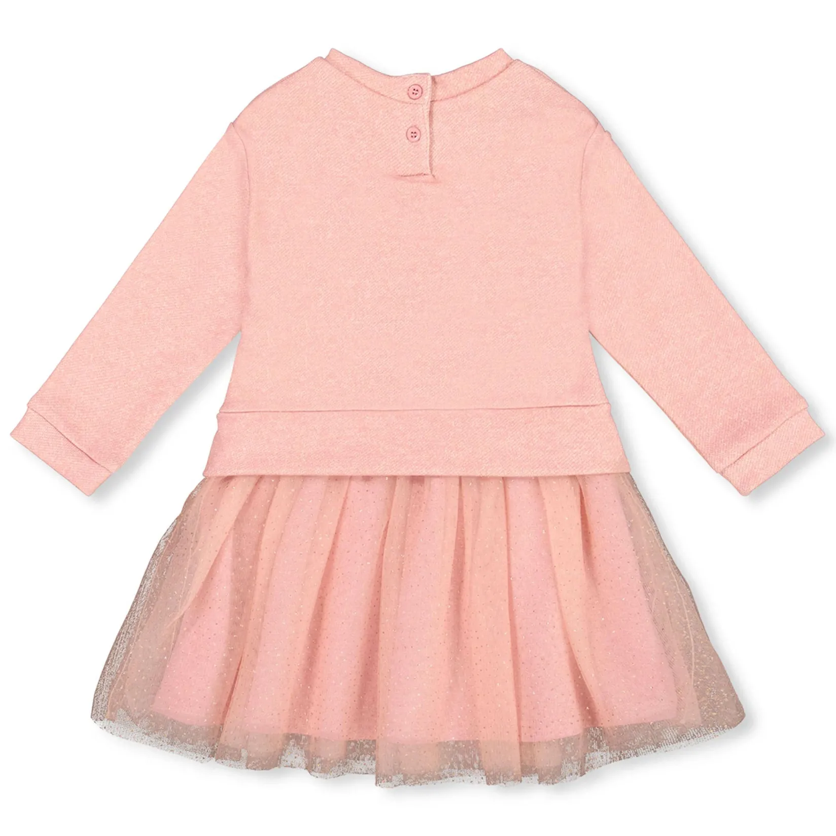 The Bi-Material Dress Dusty Pink With Mesh Skirt and Unicorn brings a magical twist to casual dressing. This dreamy sweatshirt-style dress features a soft french terry bodice with a sparkly unicorn print, and a flared mesh skirt with an allover polka dots print for extra flair. With a comfy fit and playful style, it’s perfect for parties, school, or weekend adventures.