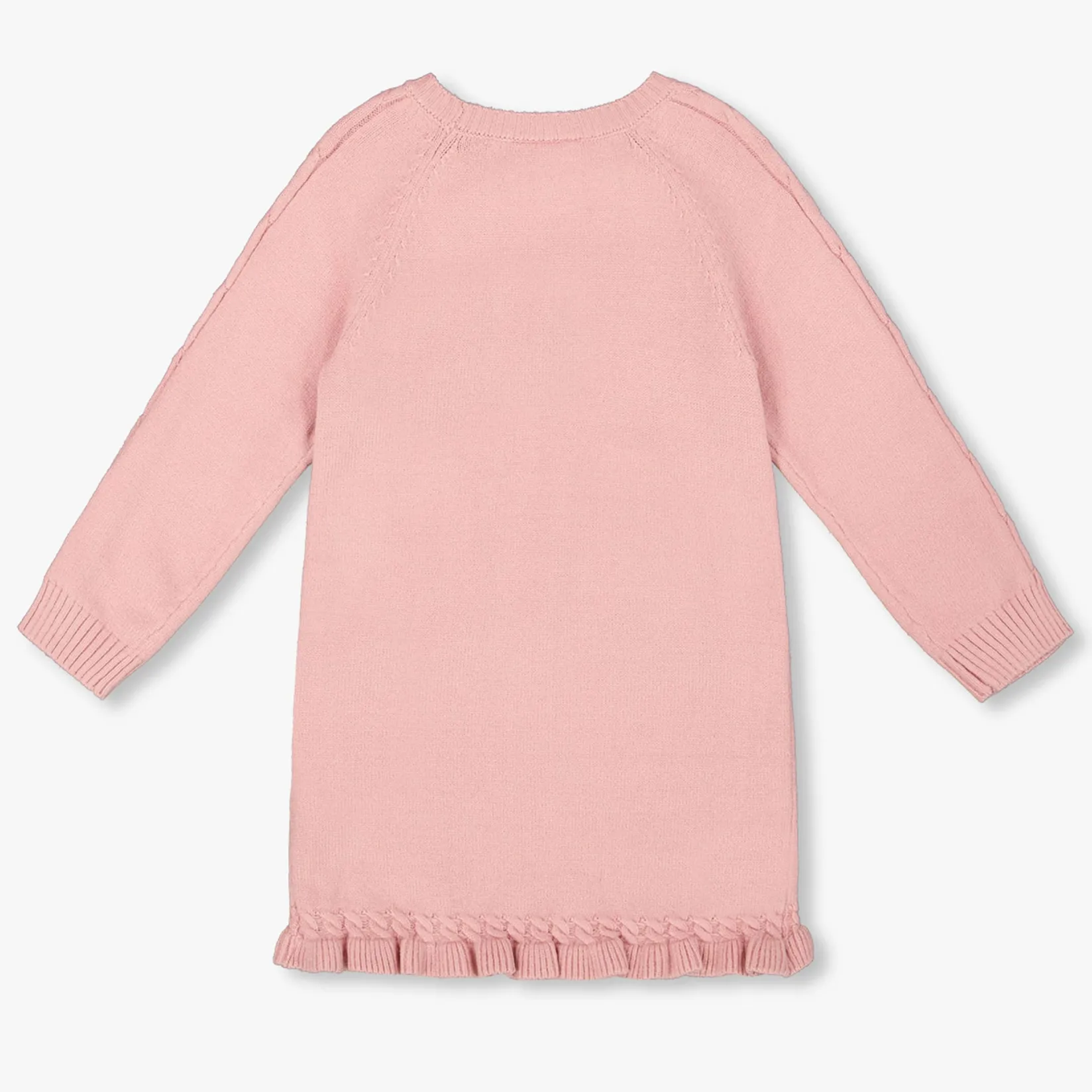 The Knitted Dress in Dusty Pink With Unicorn Intarsia brings charm and softness to any fall wardrobe. Made from a cozy knit blend, this sweater dress features long raglan sleeves in a textured knit, a large jacquard unicorn with glittery details on the chest, ribbed trims, and delicate ruffles at the bottom hem for extra flair. Its easy pull-on fit makes this dress perfect for school days, weekend fun, and everything in between.