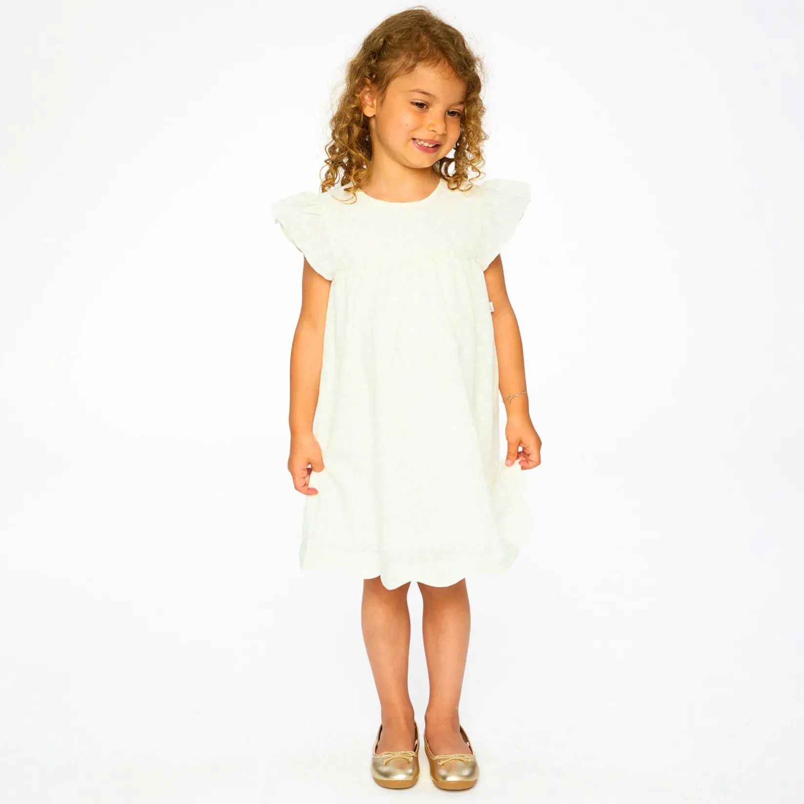 Our printed poplin dress in off-white is a light and playful style for sunny days. This A-line dress features flutter ruffles at the shoulders, a round neckline, and delicate gathers under the chest for extra charm. Made from crisp cotton poplin with an allover off-white floral print, this dress is perfect for any girl.