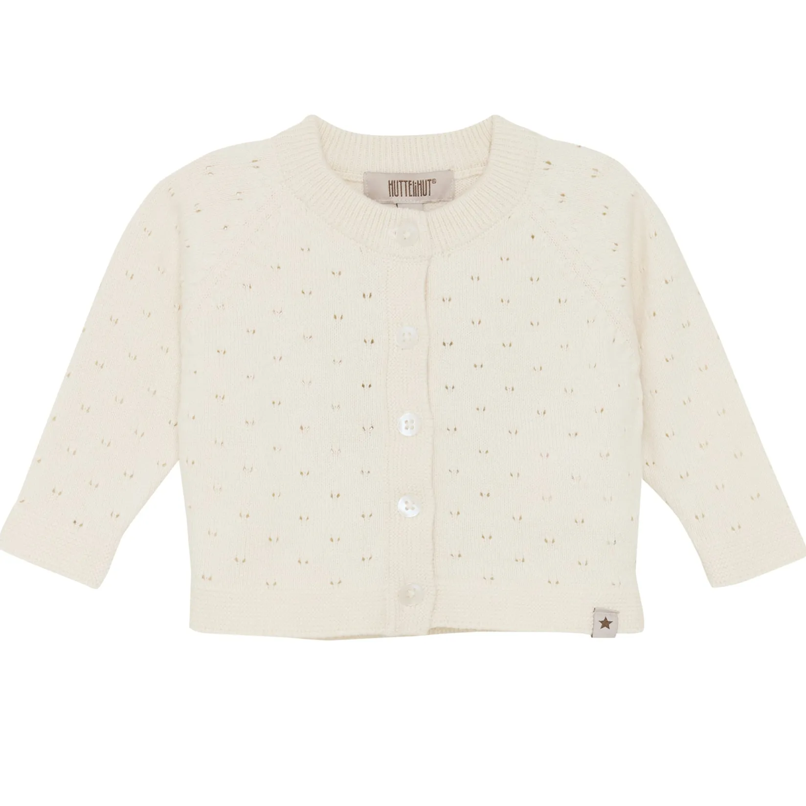 Cardigan from HUTTEliHUT with pointelle pattern. It has mother-of-pearl buttons. Certified acc. to GOTS – organic CERES-0366