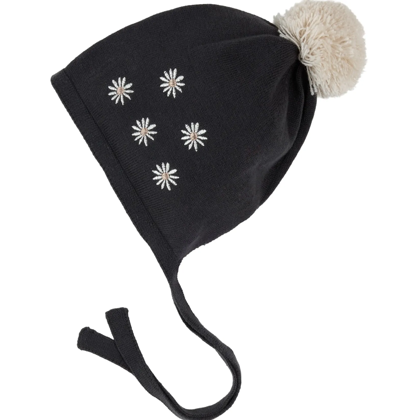 The perfect accessory for a vintage style, this jersey knit bonnet has little daisies on the side, a tie under the chin and a pompom on top to complete the look. Keeping her toasty and snug, the bonnet is lined with a cozy micropolar lining. Designed to perfectly coordinate with the sweater knit playsuit in the same range.