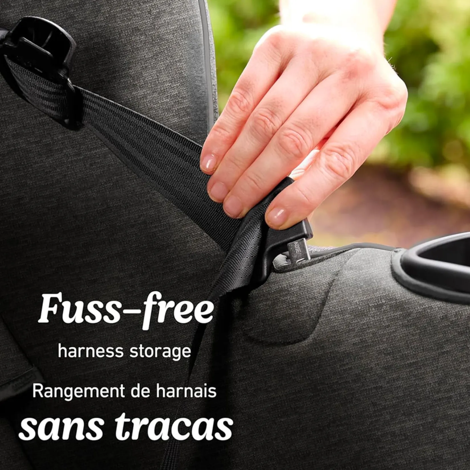 Fuss-free harness storage pockets conveniently hold the harness out of the way for easy in and out