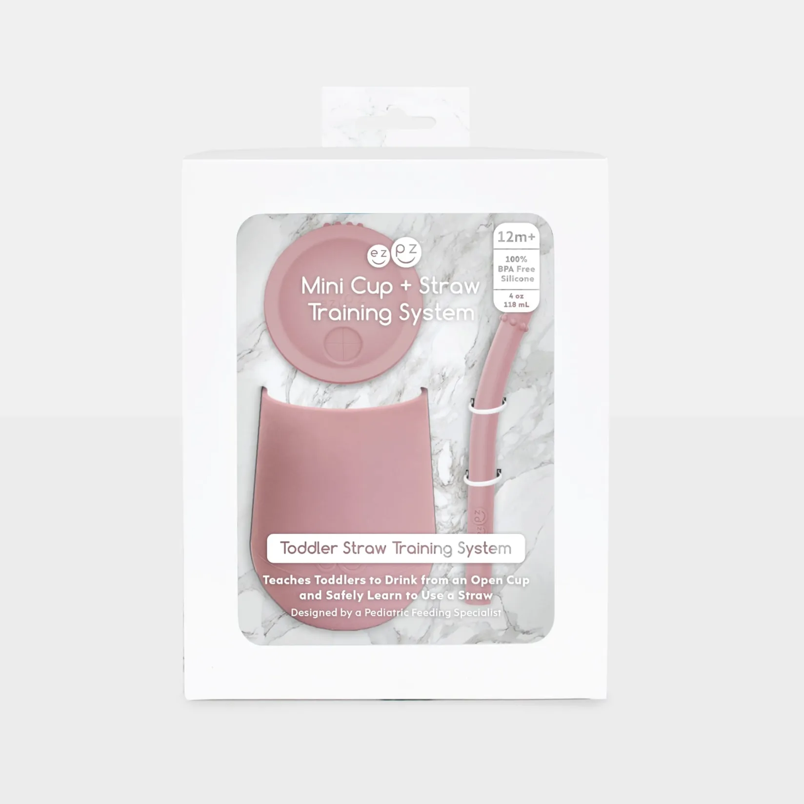The ezpz Mini Cup + Straw Training System teaches toddlers to drink from an open cup and safely learn to use a straw.