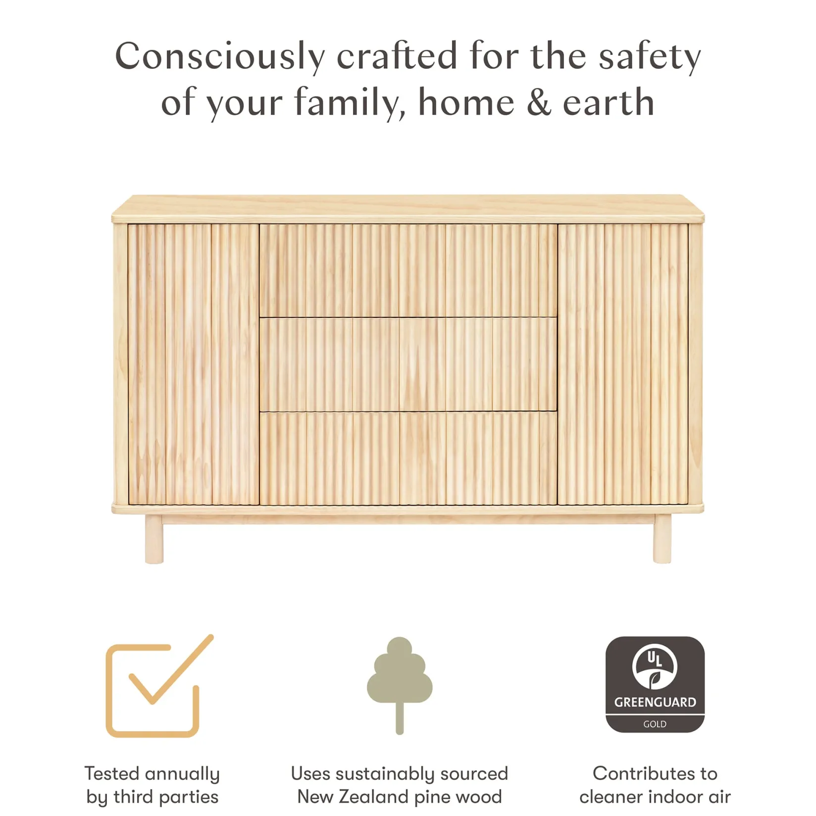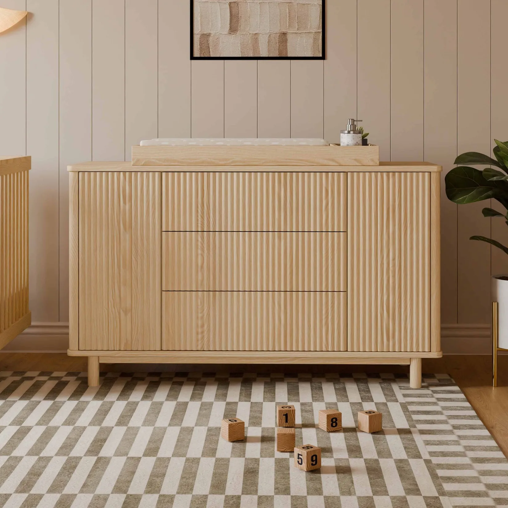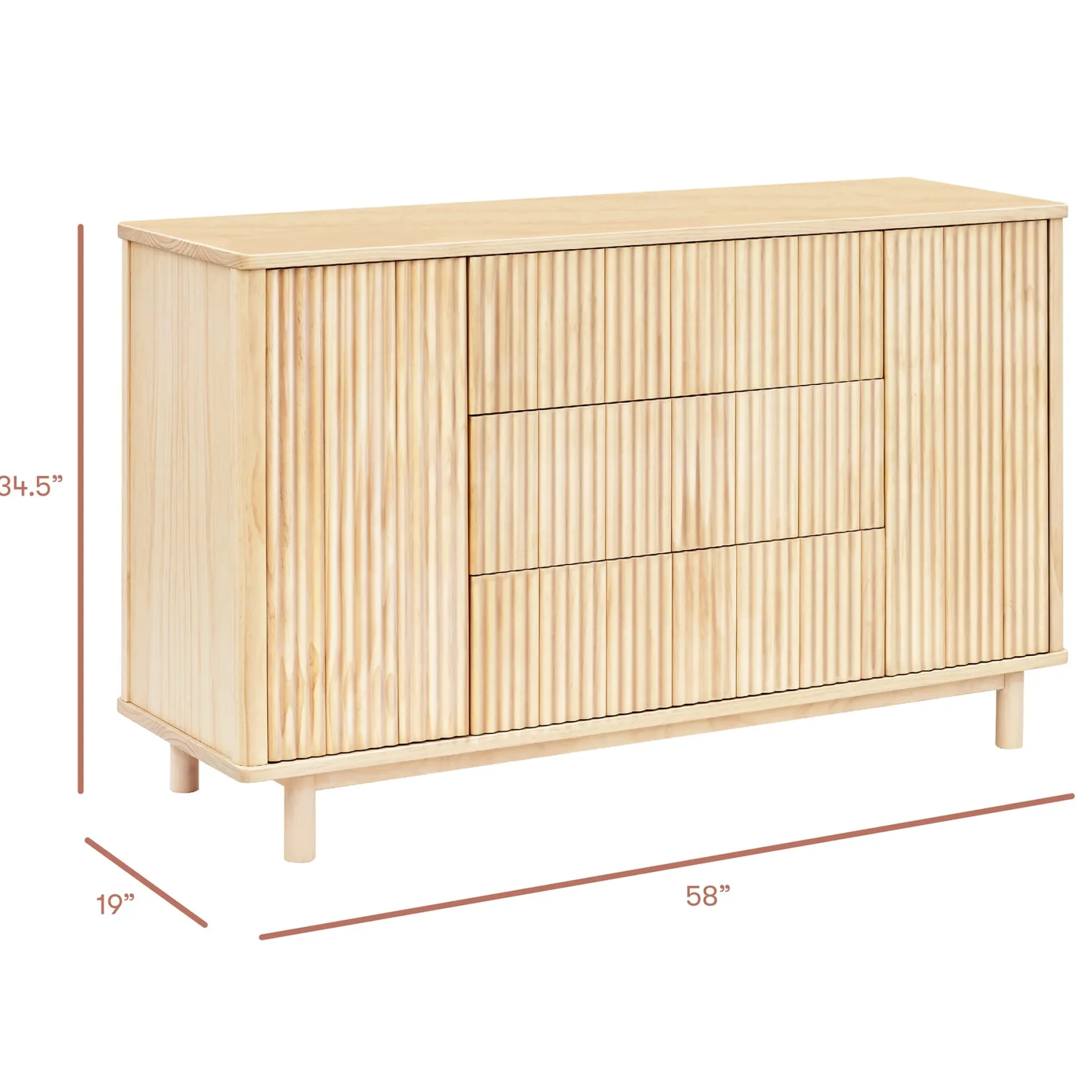 The timeless Pogo Tambour Assembled Dresser exudes modern elegance with its textured fluted tambour paneling, smooth, rounded edges, and elevated silhouette. Designed for the nursery but beautiful enough for use throughout the home, it features push to open smooth-gliding drawers, spacious side cabinets, included anti-tip kit for safety, and best of all, it arrives fully assembled, ready out of the box.