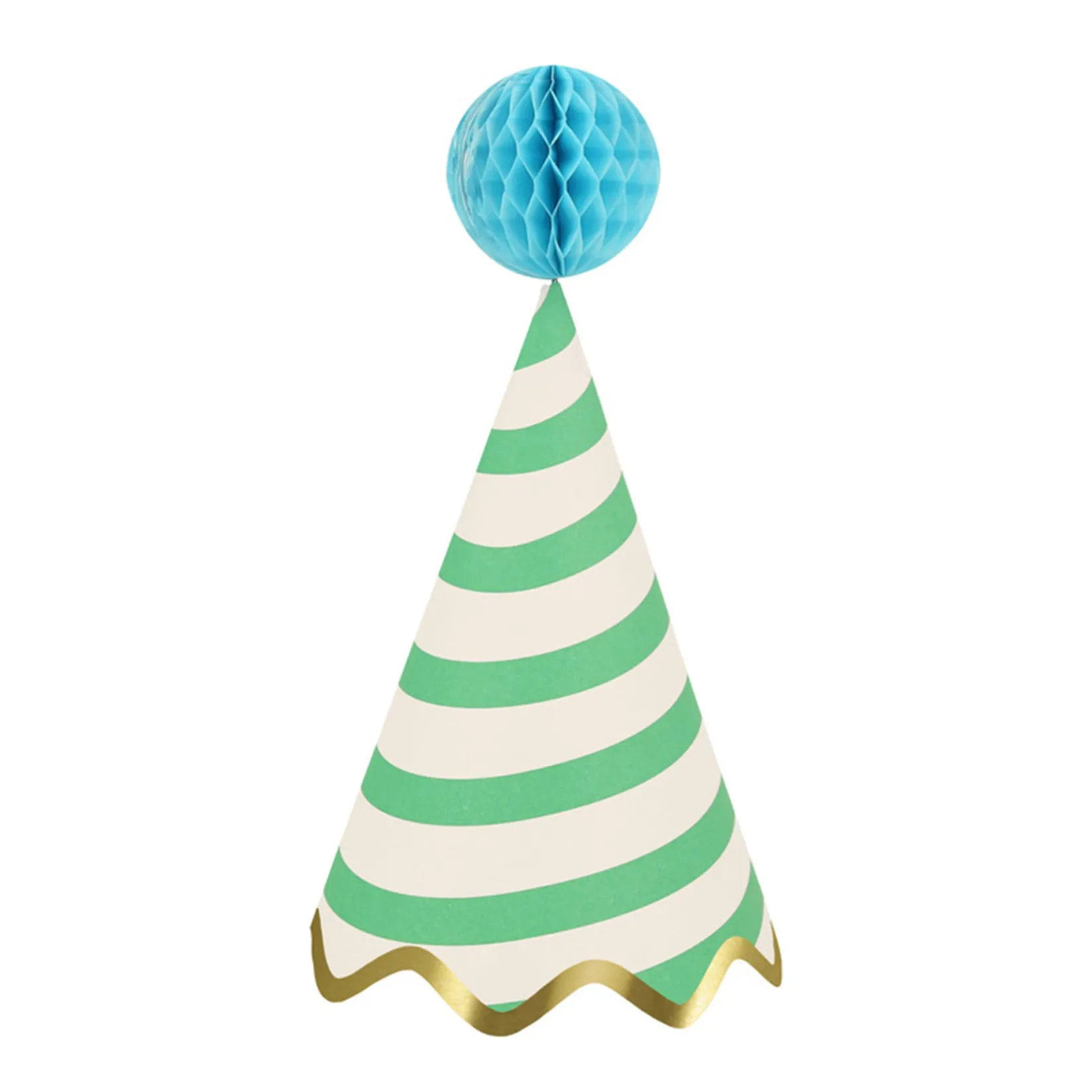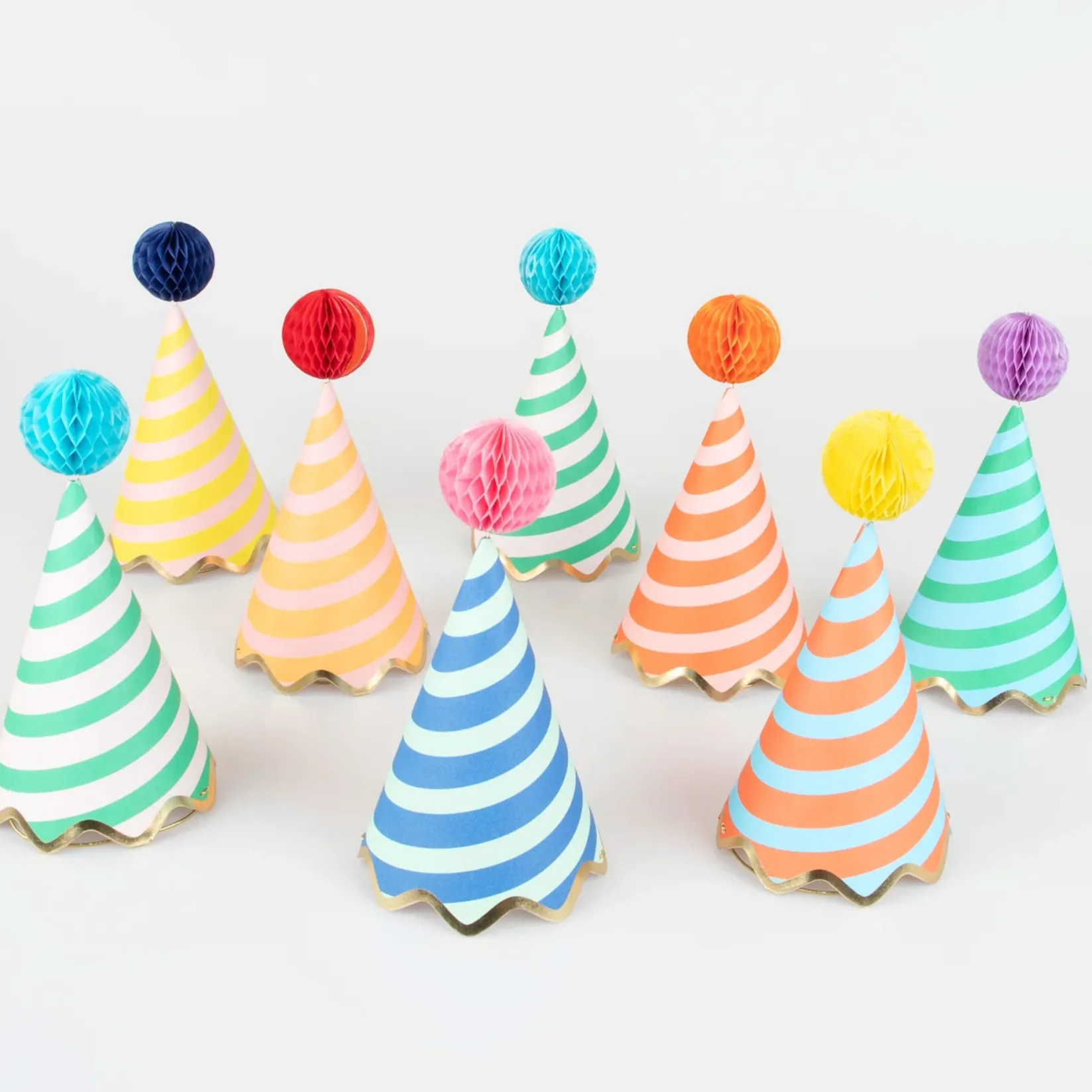 -Party hats in 8 bright colors1.57 inch honeycomb balls in 8 complementary colors. They come with double sided tape to hold them open, and wire inside to allow them to be moveable.