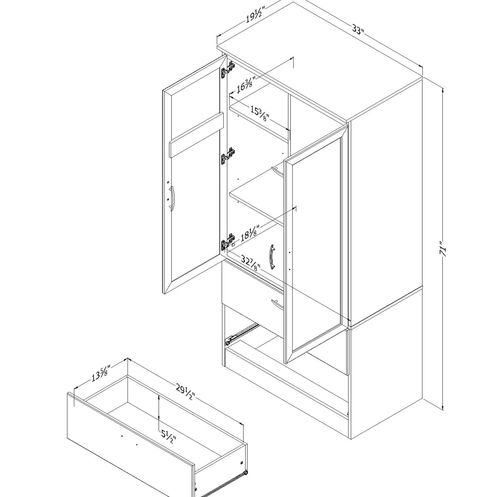 Dimensions: 33″ W x 19.5″ D x 71″ H, 137 lb. / 84 x 49.75 x 180.5 cm