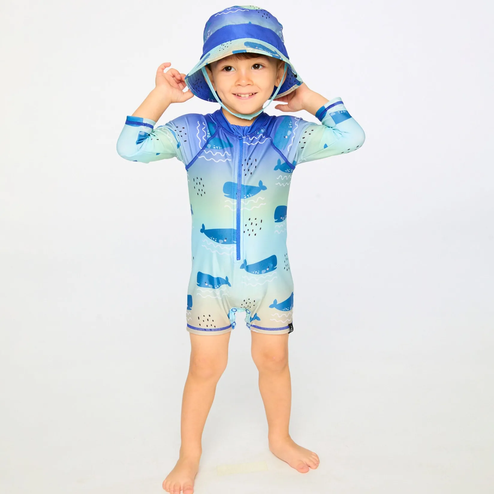 Our baby and toddler one-piece long sleeve rashguard in blue with whale print makes a splash in summer style. This one-piece swimsuit features long sleeves and a playful allover whale pattern in shades of blue, made from recycled polyester with added stretch for comfort and easy movement. A front zipper makes dressing simple while providing extra protection under the sun for boys and baby boys.